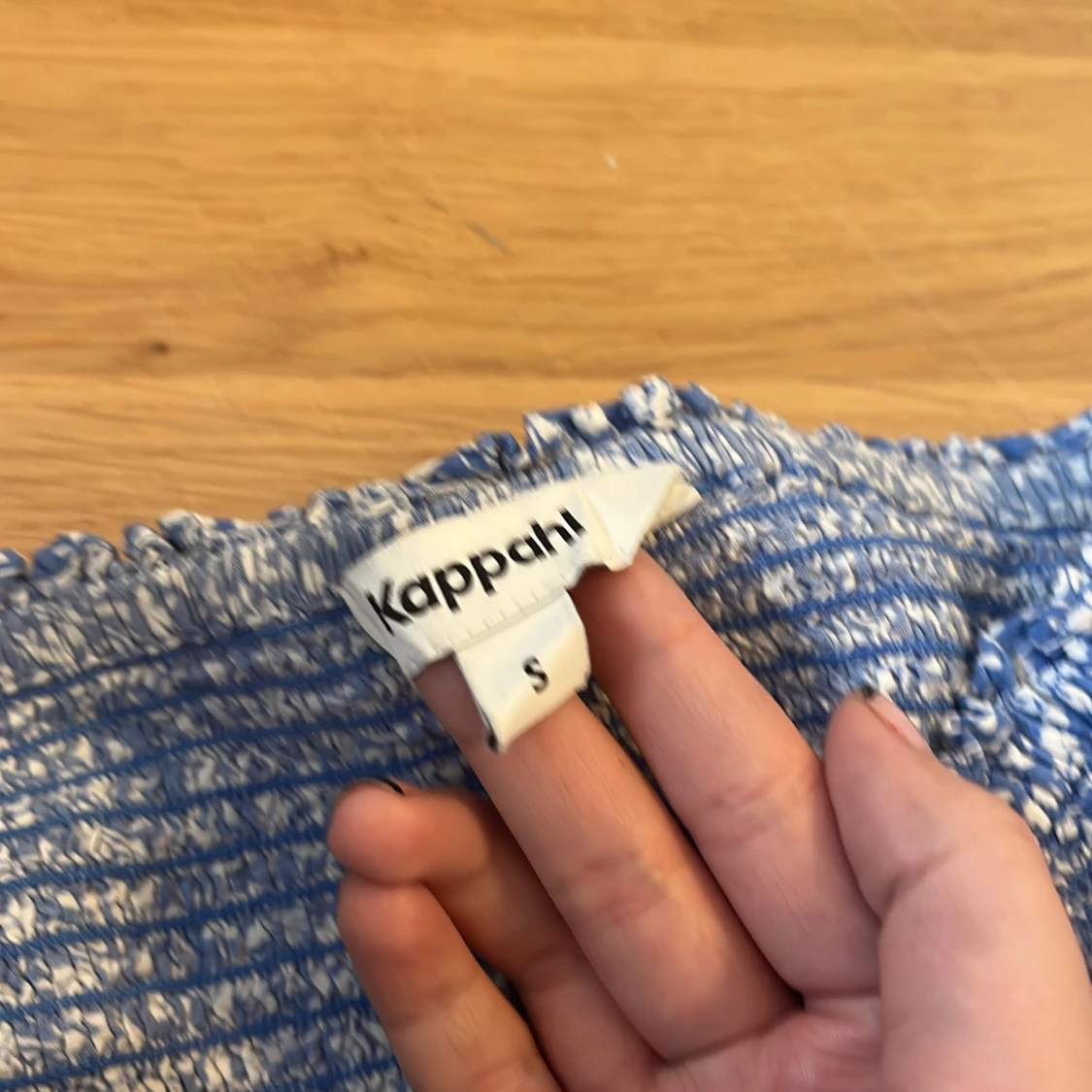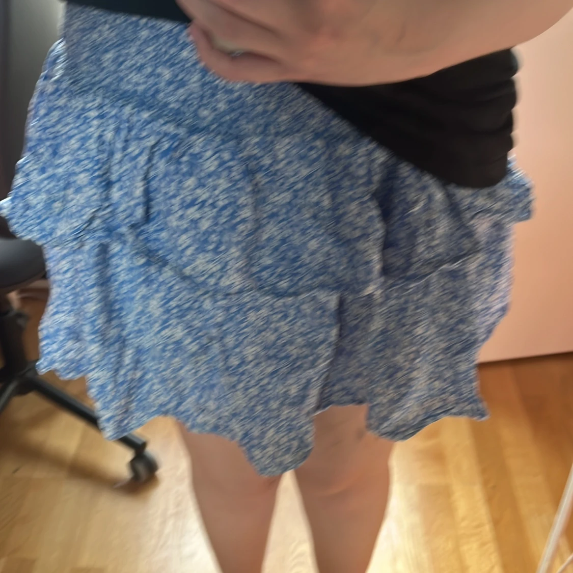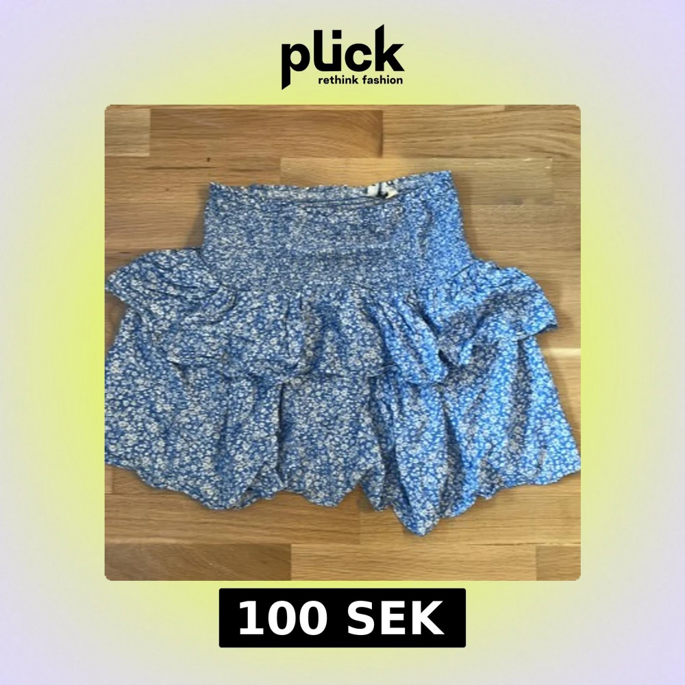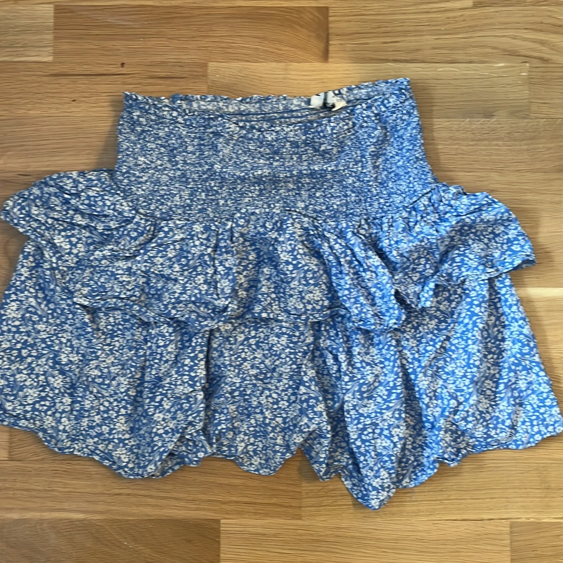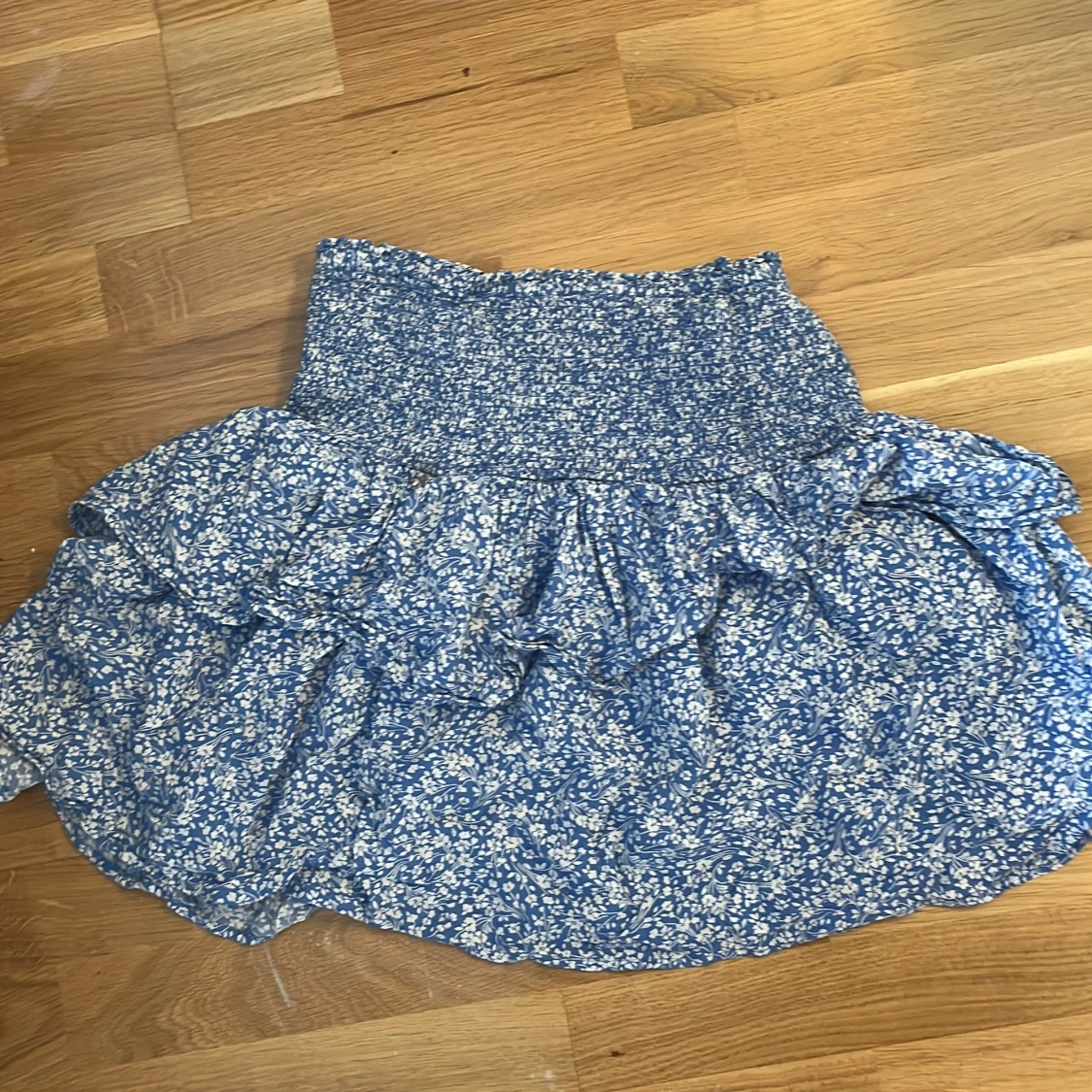 Supersöt blå kortkjol från Kappahl med vitt blommönster och volangdetaljer. Kjolen har smock i midjan för en bekväm passform och är gjord i ett lätt och luftigt material. Perfekt för dig som gillar en feminin och somrig stil! Helt okej skick, använd få gånger