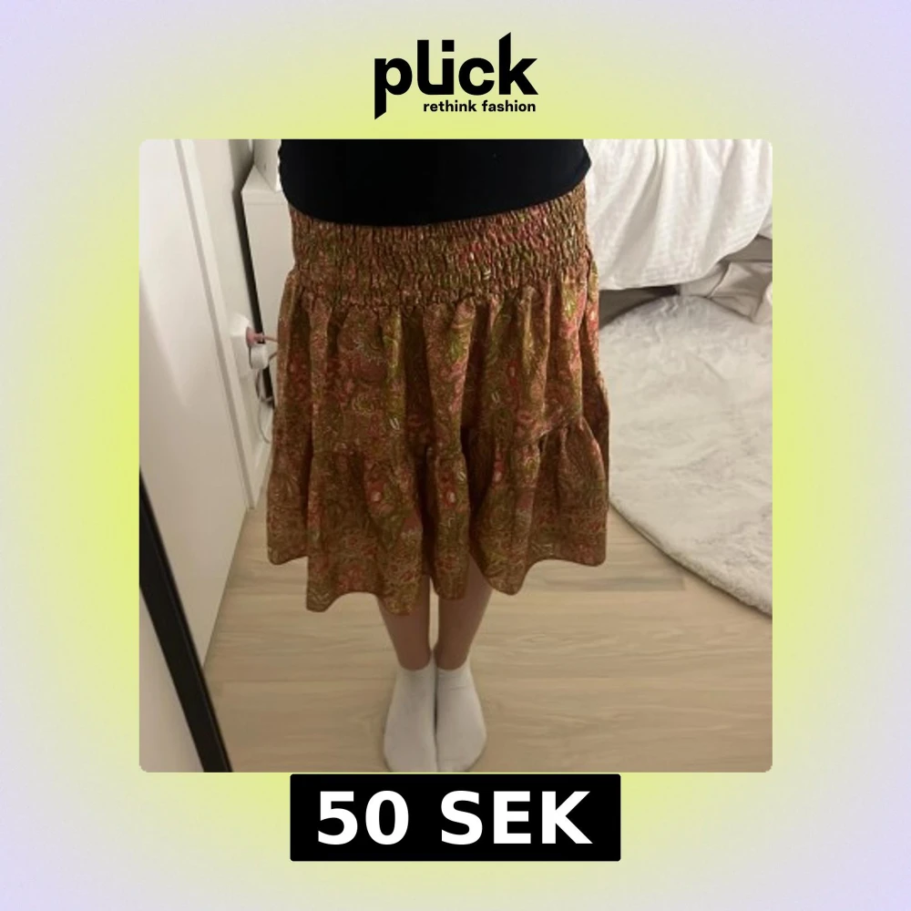 Supersöt kortkjol med volanger och smock i midjan. Kjolen har ett paisleyinspirerat mönster i rosa, grönt och inslag av beige. Lätt och flowy känsla, perfekt för varma dagar. Passar dig som gillar boho-vibe och vill ha något färgglatt och bekvämt.Storleken är 32 men kan göra större för att det är ett väldigt stretchat material