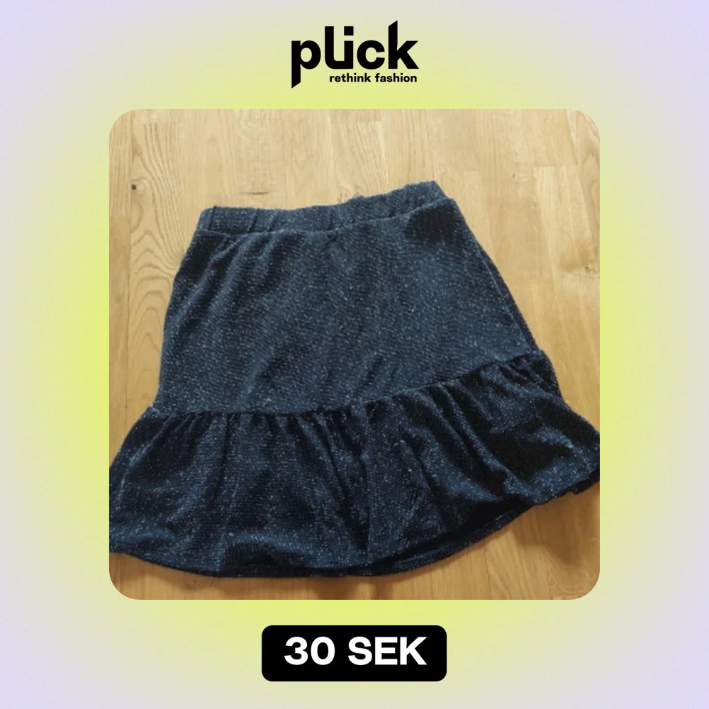 Fin glittrig kjol som passar till fester. Små defeker (se bild 3), men märks inte. I barnstorlek men passar xs skulle jag säga.