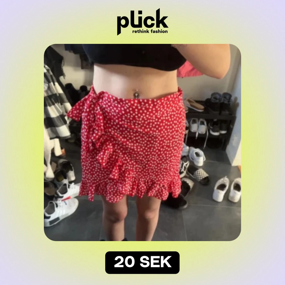 En röd kjol, den går att knyta så jag skulle säga att den passar de flesta storlekar, den är relativt lång där bak och bra skick.