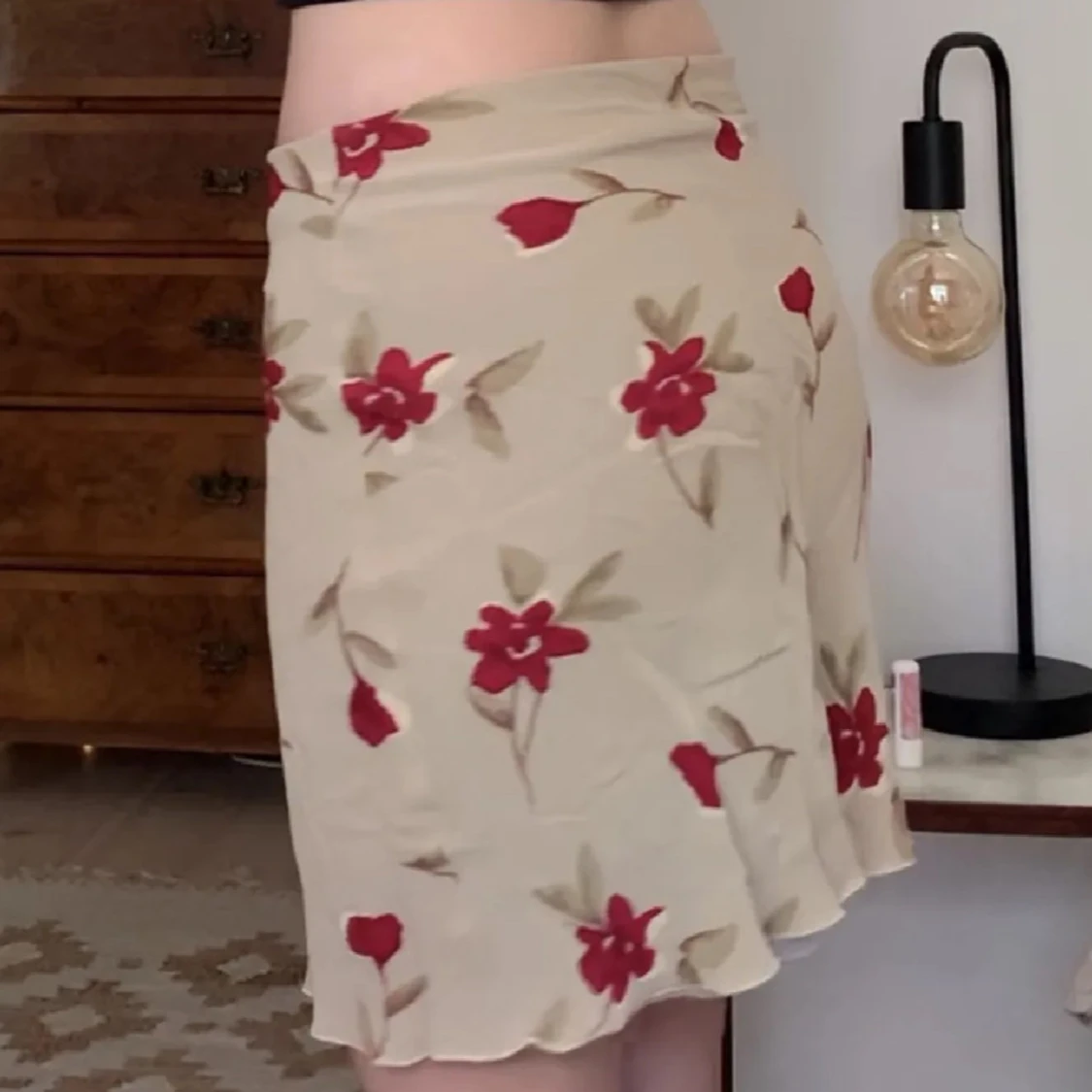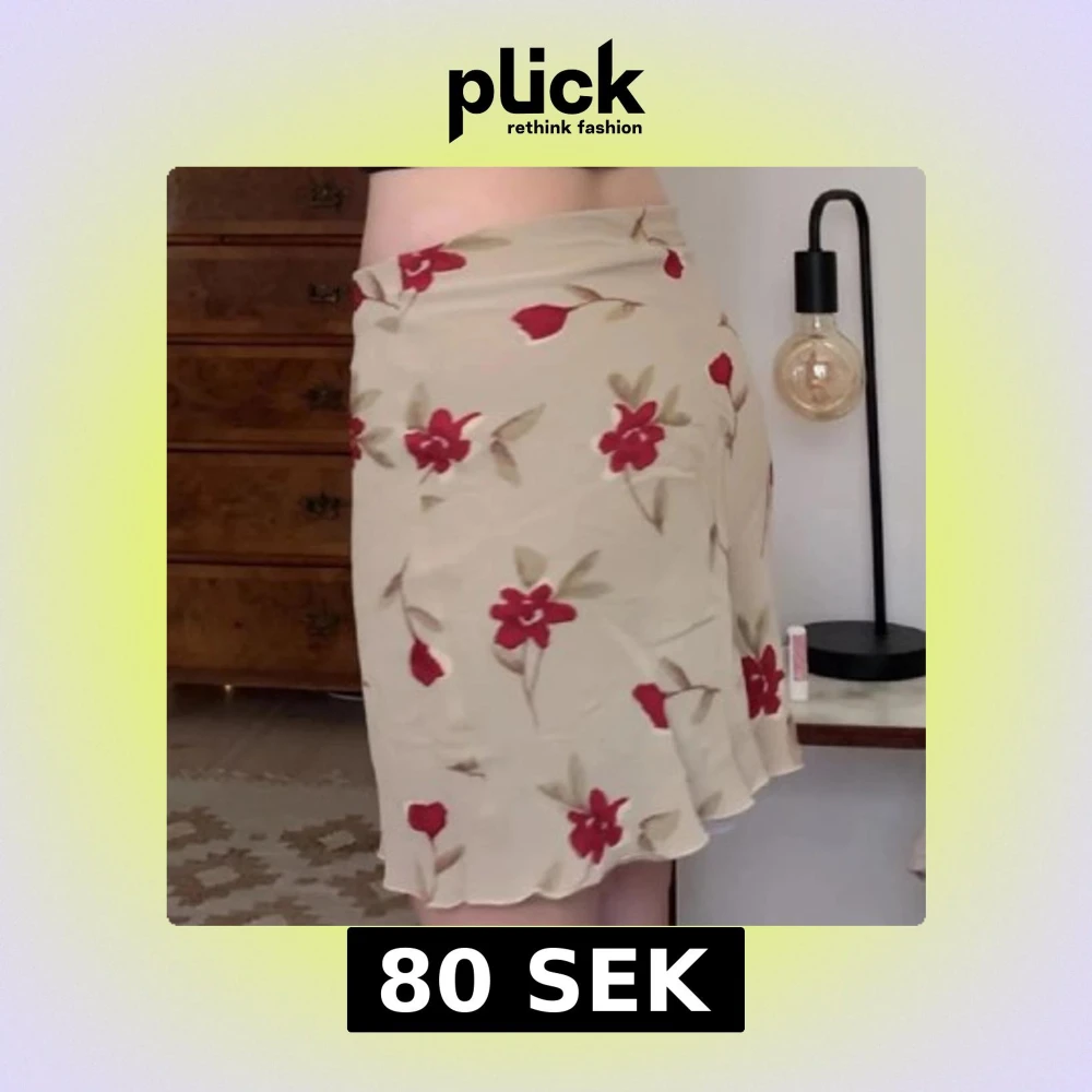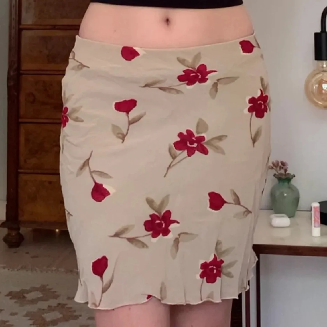 Säljer en beige kjol med röda blommor och gröna blad. 💕