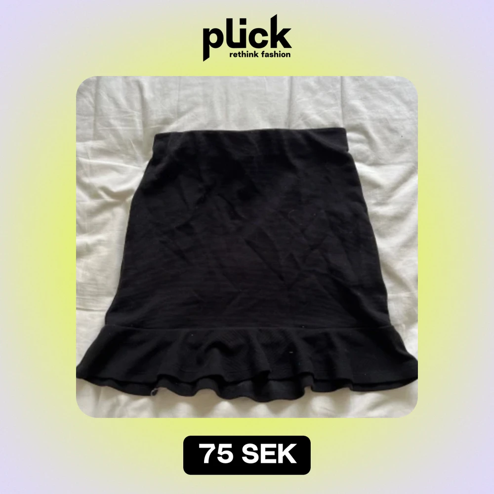 Säljer en snygg svart kjol med volangdetalj längst ner. Kjolen är tight och passar perfekt för både vardag och fest. Den är i bra skick och har en enkel men stilren design. Storlek 158/164 i barn men passar mig som har XS/S