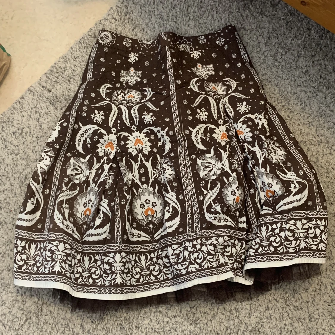 Brun mönstrad kjol från esprit i storlek 36. Den går till knäna på mig. Den öppnas med en dragkedja i sidan. Den har också en innerkjol inuti.