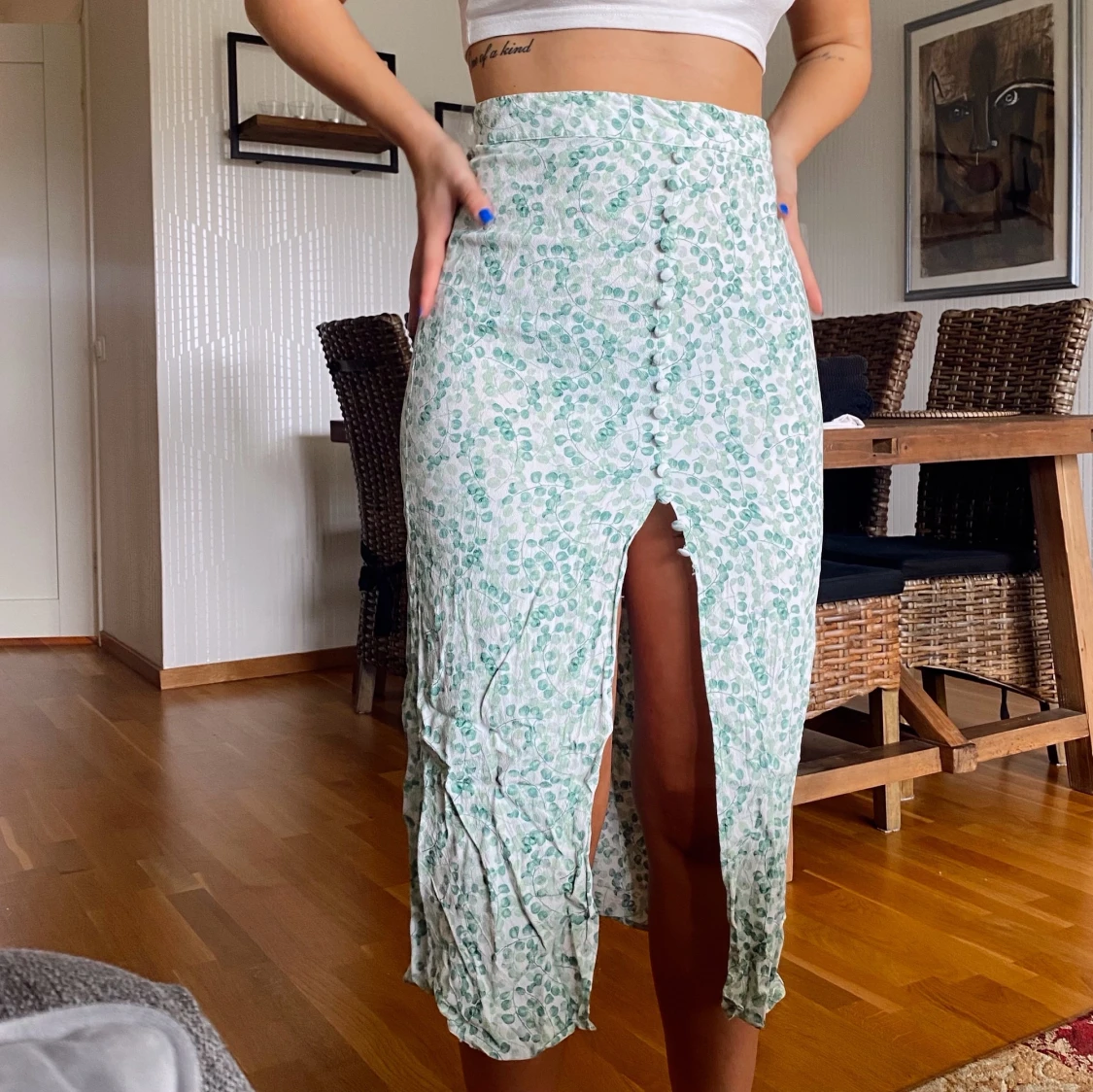 Härlig blommig kjol! Säljer billigt pga två knappar som gått sönder som man ser på sista bilden. Annars fint skick! Använt 1 gång. 💚