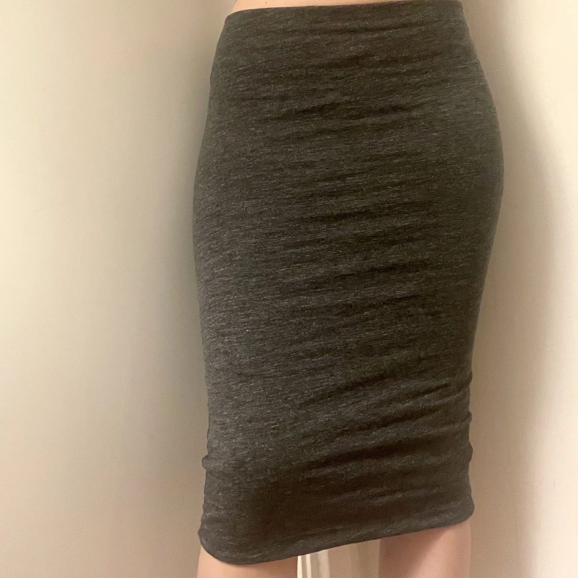 Tight mörkgrå kjol som slutar nedanför knäna på mig som är 165 cm. Ganska stretchigt material. Funkar nog även att ha som klänning. Kan mötas upp nära Mariatorget eller posta.