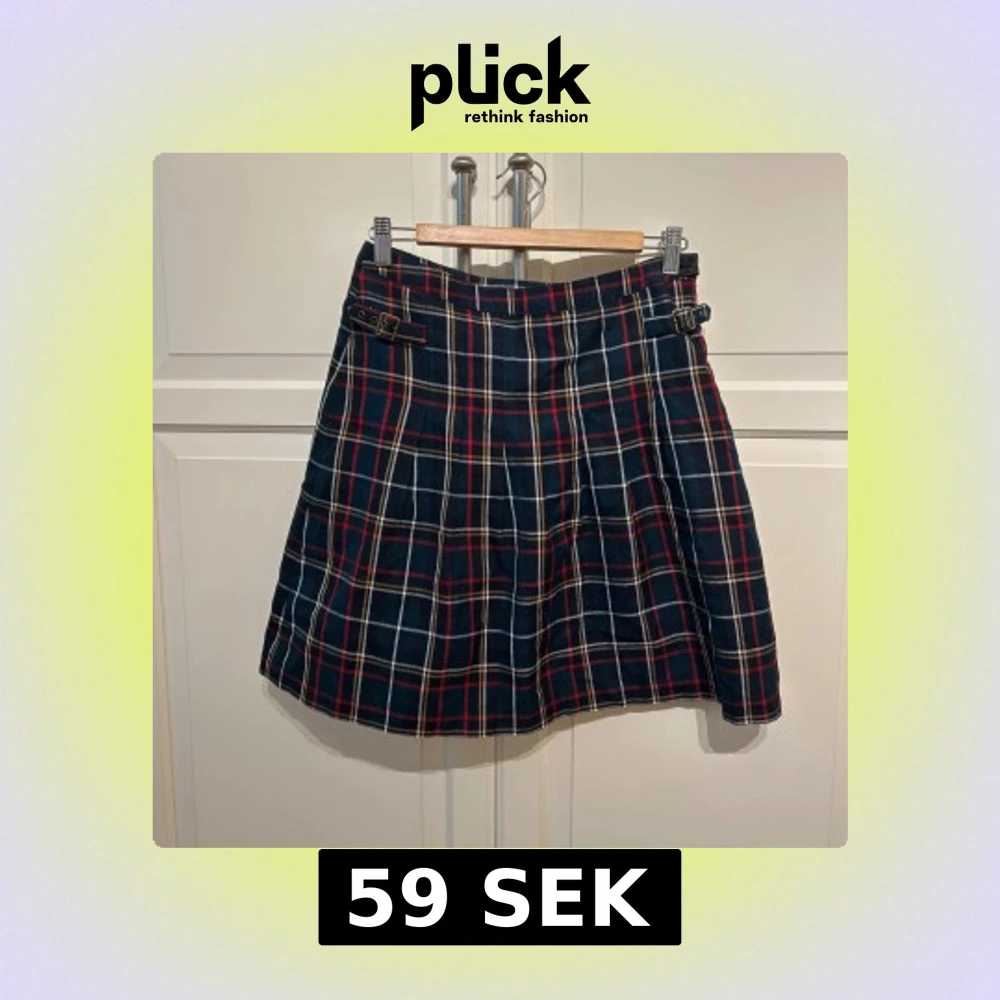 Mörkgrön rutig kjol från Frk i storlek 38 med röda, vita och gula ränder. Kjolen har två dekorativa spännen i midjan och är fodrad på insidan. Klassisk A-linjeformad modell som passar perfekt till höst och vinter.