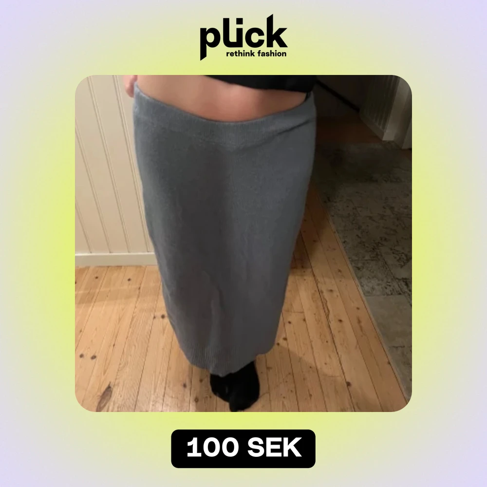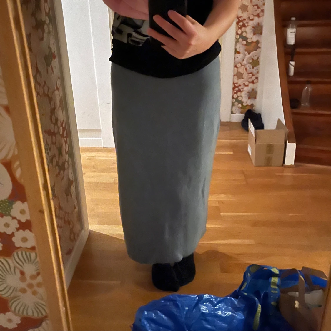 En stickad blå långkjol, sitter inte tajt! Är 165 cm och den går till mina vrister 😇. Kjolen är köpt secondhand och inte använd sen dess 🧑🎤.