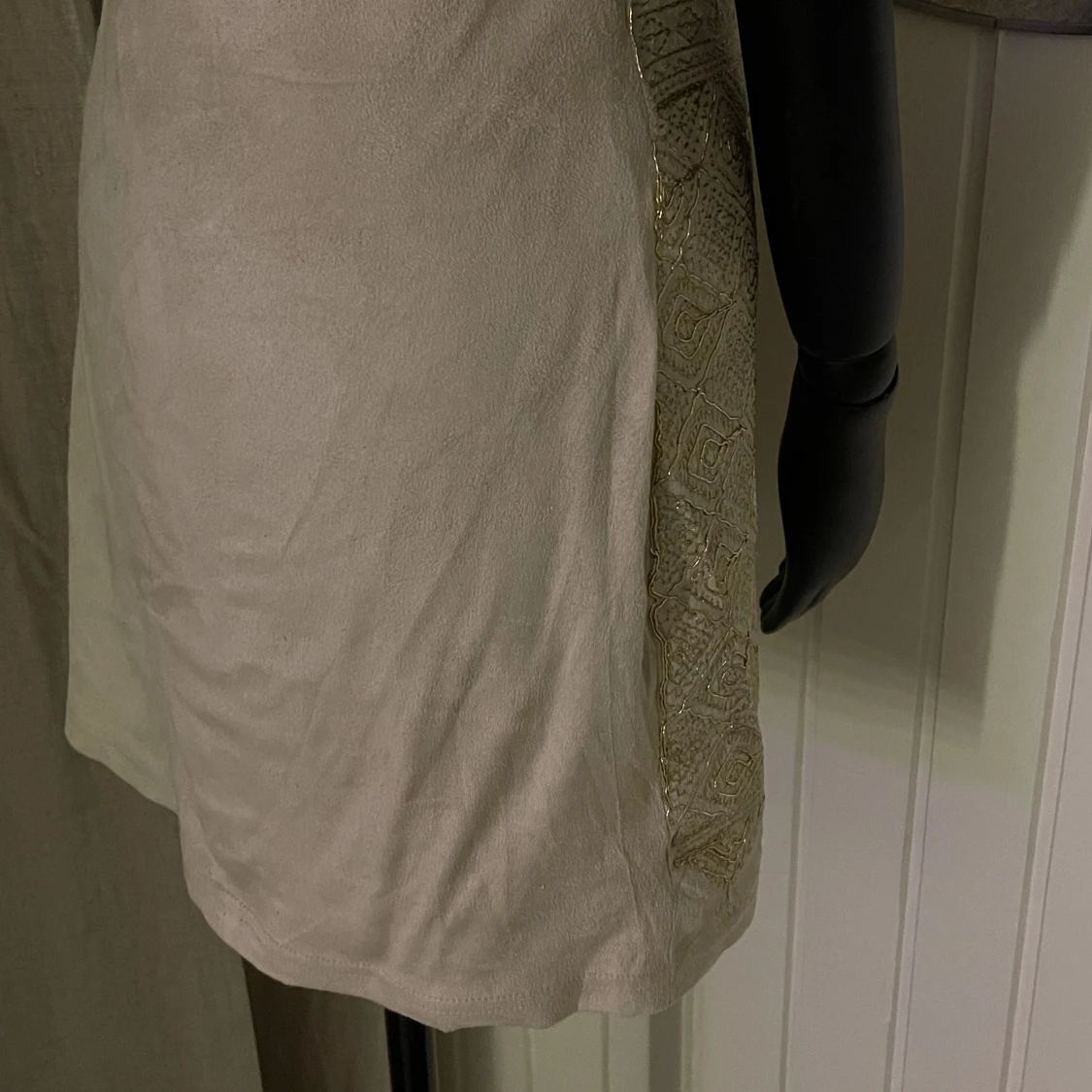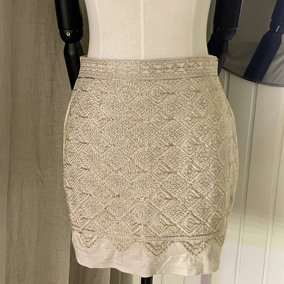 En kort beige kjol med ”guldigt” mönster på framsidan💓 aldrig använd🫶 skriv till mig om fler bilder önskas🥰