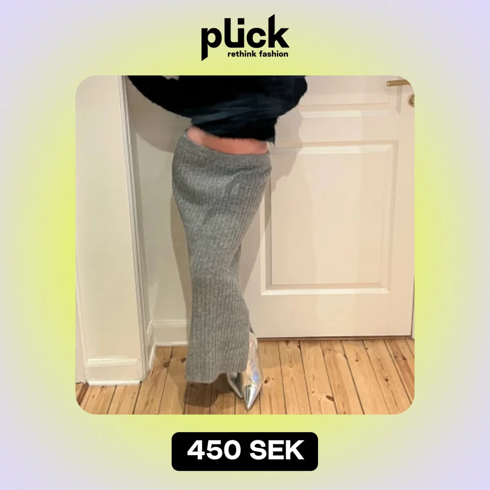Stickad grå kjol med slits. Passformen är tajt vid höfterna men utstickande ner till benen. Sitter super smickrande på kroppen. Väldigt bra kvalite på materialet. Super snygg till våren! Storlek: S, men passar mig som har har storlek XS.