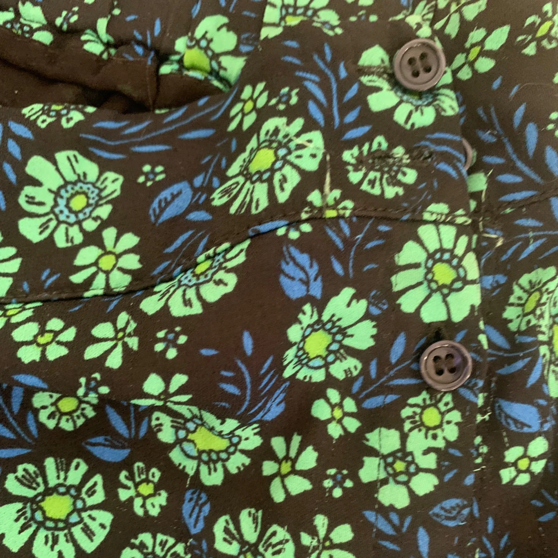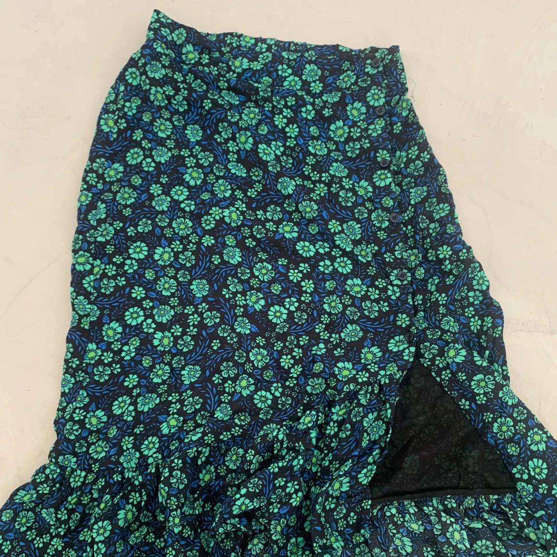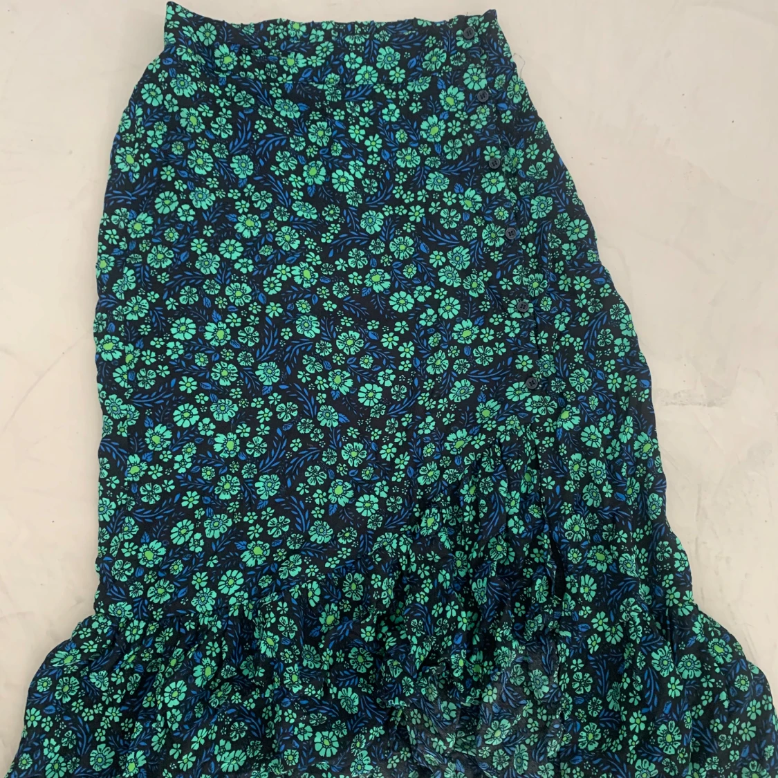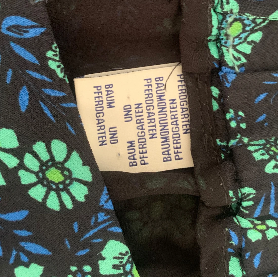 Supersnygg långkjol från Baum und Pferdgarten med blått och grönt blommönster på svart botten. Kjolen har volang nertill och knappar längs sidan. Kjolen går precis ned till fötterna på mig som är 168cm. Pris går att diskuteras!