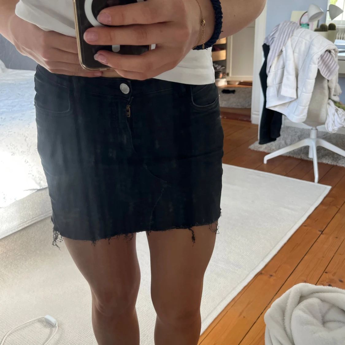 Säljer en svart kort jeanskjol med rå, fransig kant nertill. Kjolen har klassisk femficksdesign och stängs med knapp och dragkedja framtill. Perfekt för dig som gillar en enkel men edgy stil.