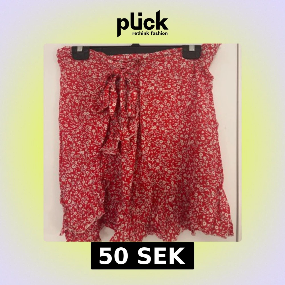 Superfin röd omlottkjol med vitt blommönster och volangkant. Går att knyta där fram, använd ett få antal gånger. Köparen står alltid för frakten!💞