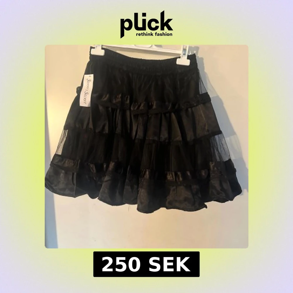 Supersöt svart kjol med flera lager volanger och transparenta partier. Kjolen har resår i midjan och en fluffig, lekfull look som passar perfekt till en trendig outfit. Helt ny. Resår i midjan. Helt ny.