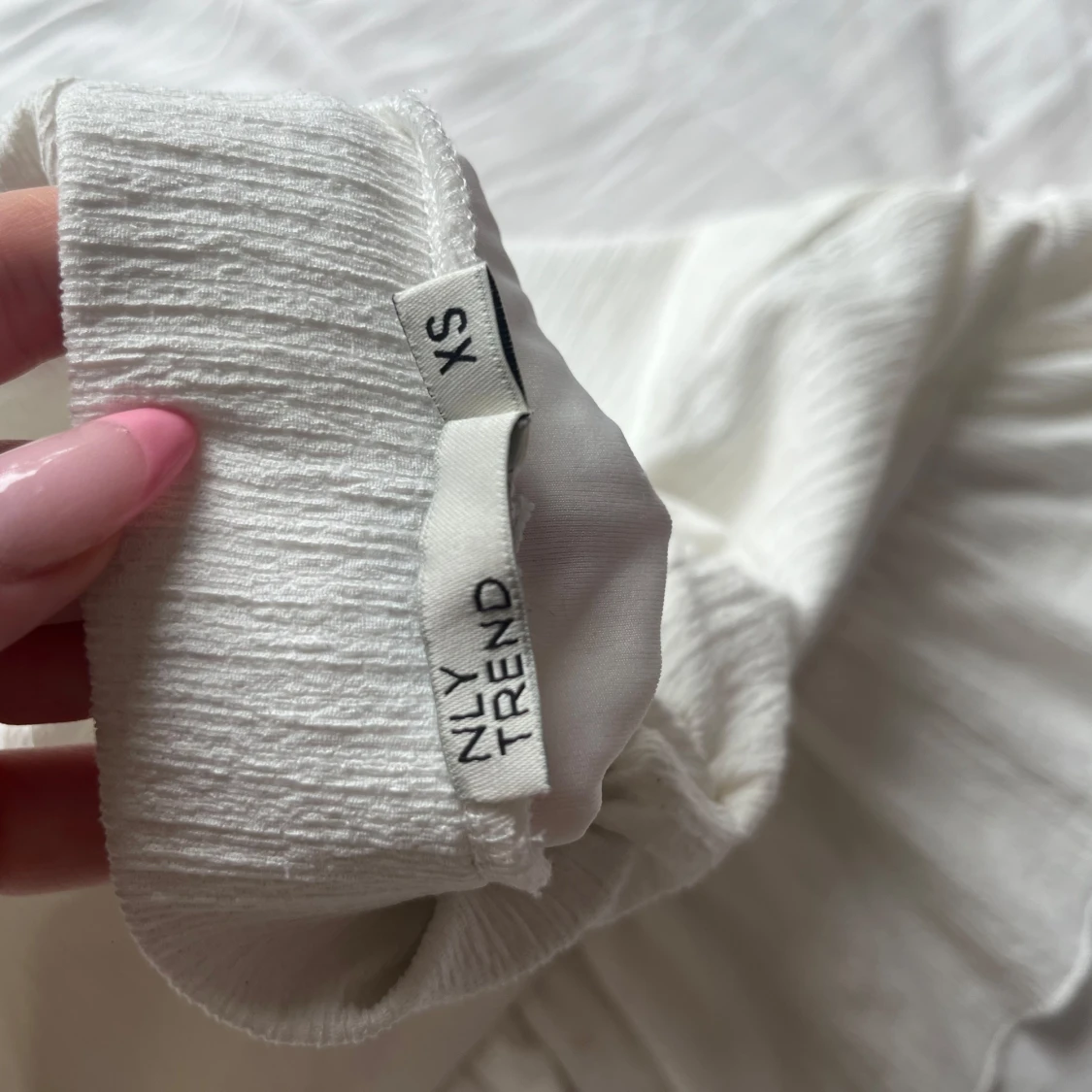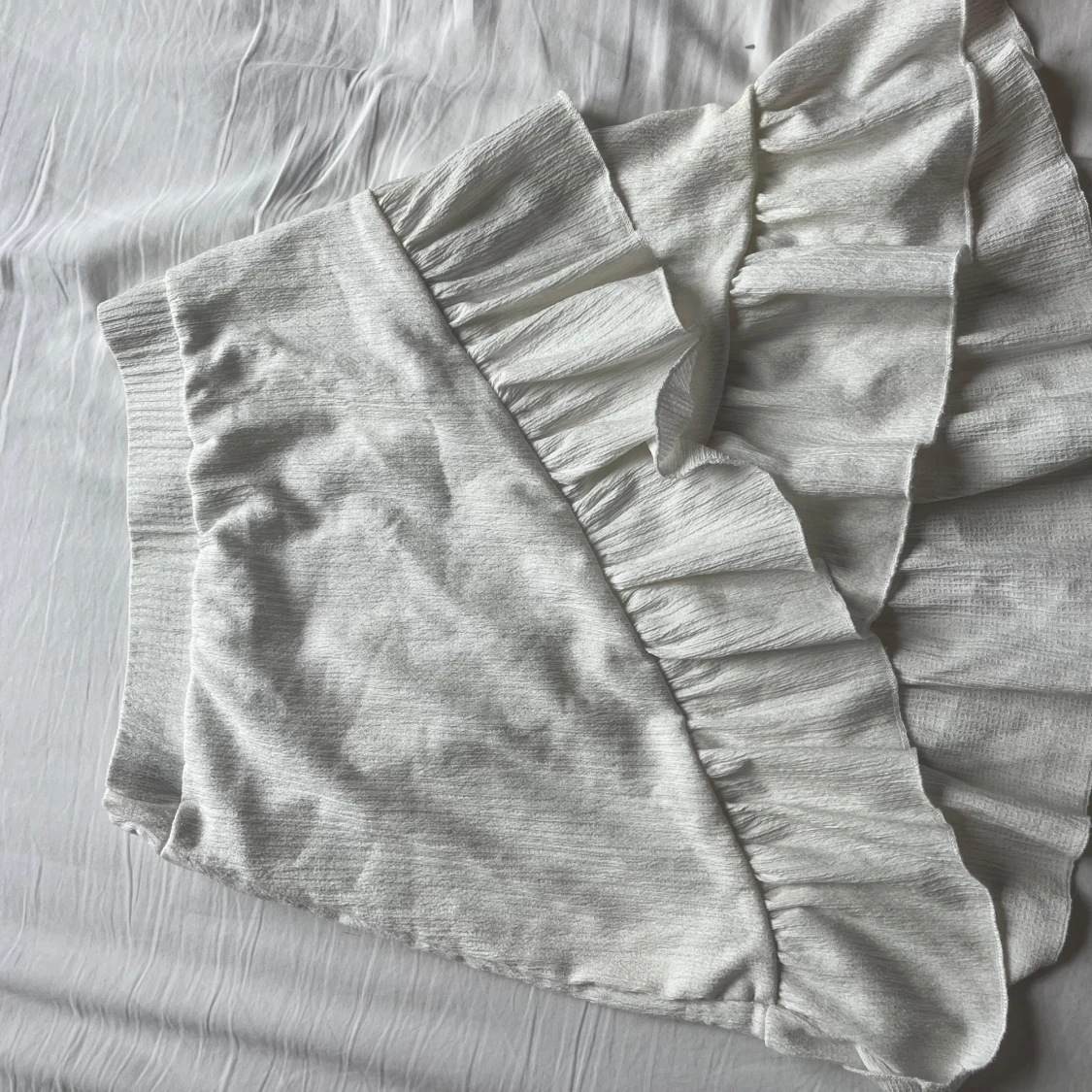 Supersöt vit kortkjol från Nell i storlek XS. Kjolen är mid Waits och har volanger längst ner. Kommer tyvärr inte till användning.