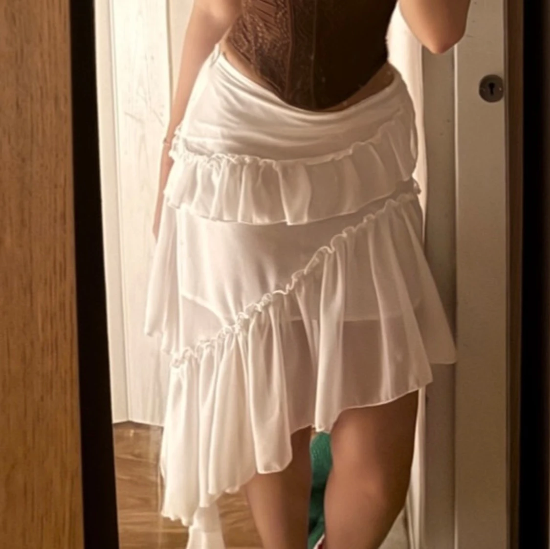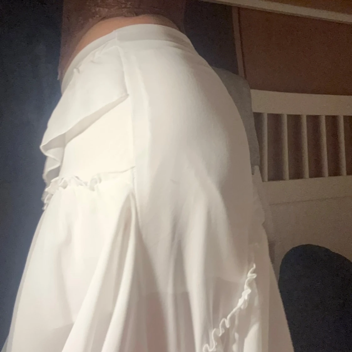 Säljer en vit kjol med flera lager volanger och asymmetrisk nederkant. Kjolen har en flowy känsla och är tillverkad i ett lätt, transparent tyg som ger en romantisk vibe. Använt bara en gång. perfekt för halloween 👻