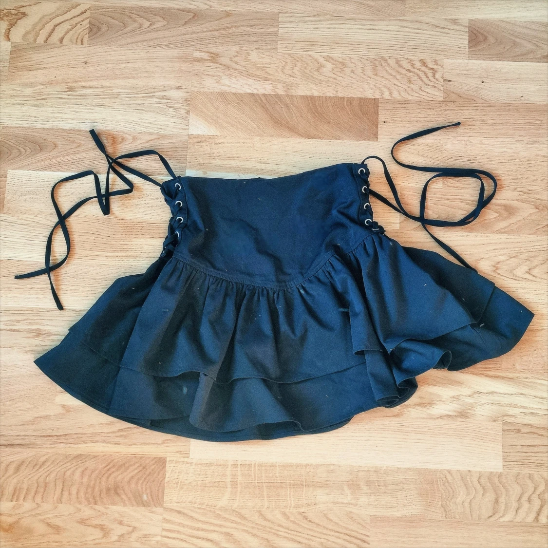 Supersnygg svart kjol med volanger och snörningsdetaljer i sidorna. Kjolen är högmidjad men har en drop-waist känsla. Dragkedja finns baktill men snörningen kan man även dra åt på sidorna för att få en mer "snatched" look.