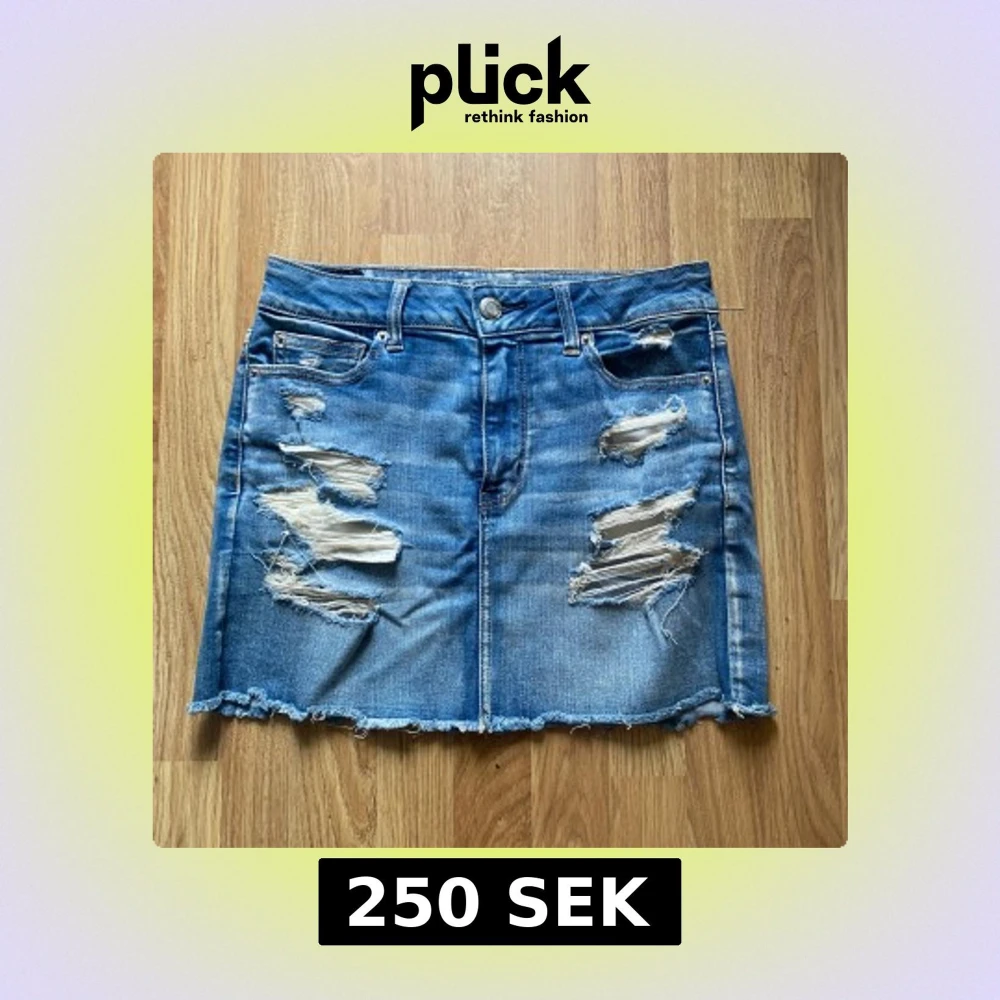 Snygg blå jeanskjol från American Eagle med slitna detaljer och fransig nederkant. Klassisk femficksmodell med dragkedja och knapp. Gjord i stretchigt denim för skön passform. Är i stolek us 10 vilket motsvarar ca 43 i europeiska storlekar men jag personligen skulle säga att den passar som en S/M. Hör gärna av er vid frågor!💕