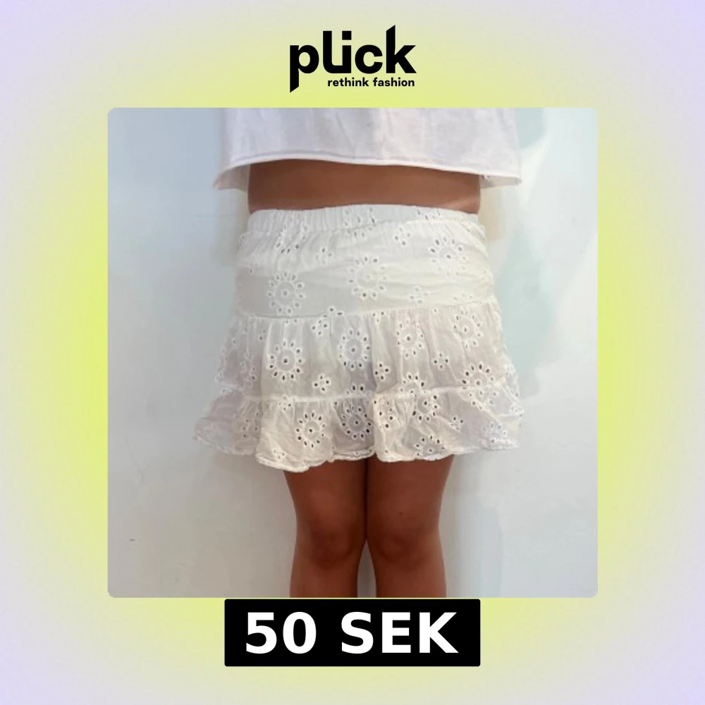 Supersöt vit kortkjol med broderade blommor och volanger. Kjolen har resår i midjan och är väldigt skön och luftig.