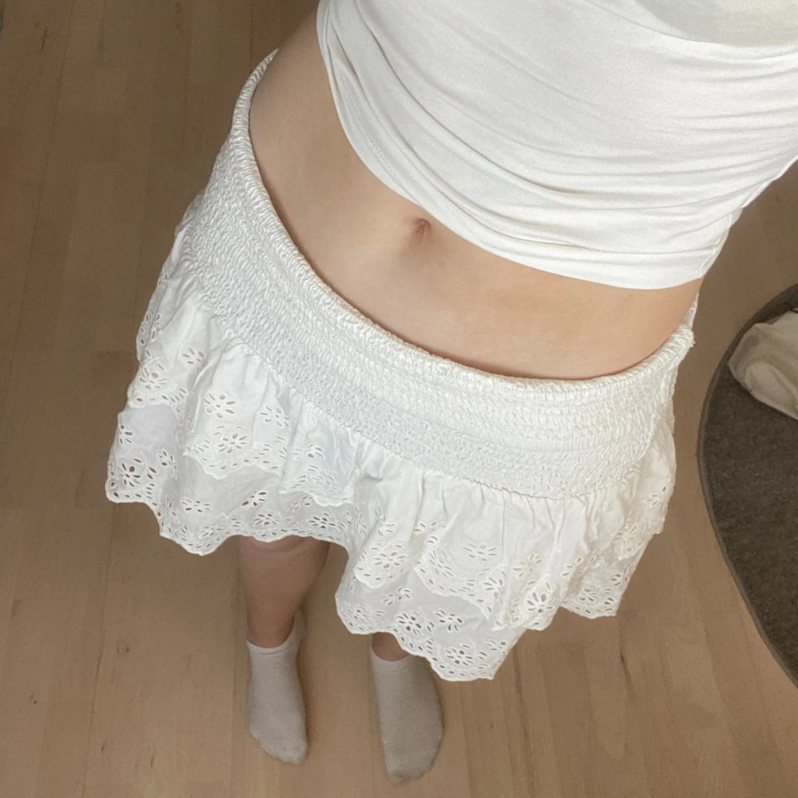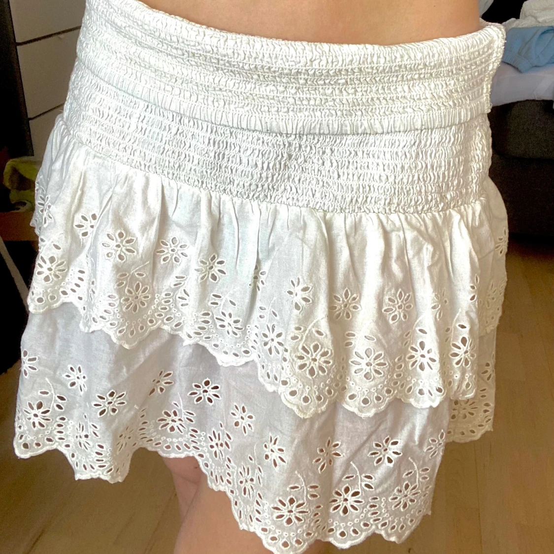 Säljer min supersöta broderade volangkjol då den blivit för stor för mig. Kan bäras både uppvikt och nervikt beroende på vad man gillar!