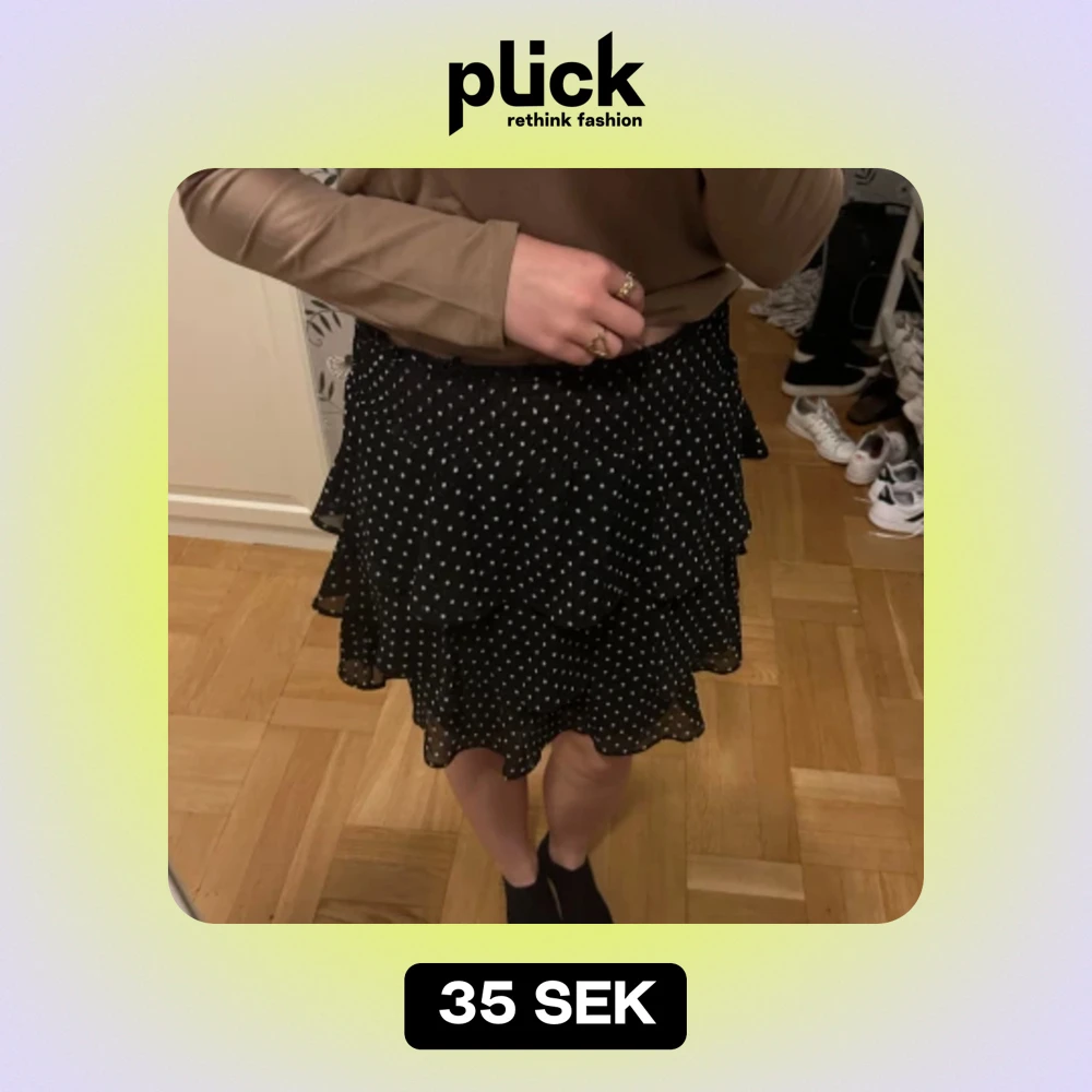 Svart prickig volangkjol har varit en klänning men är avklippt