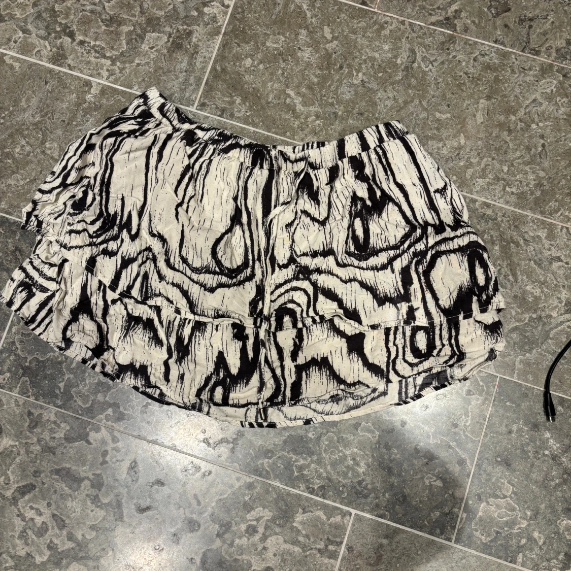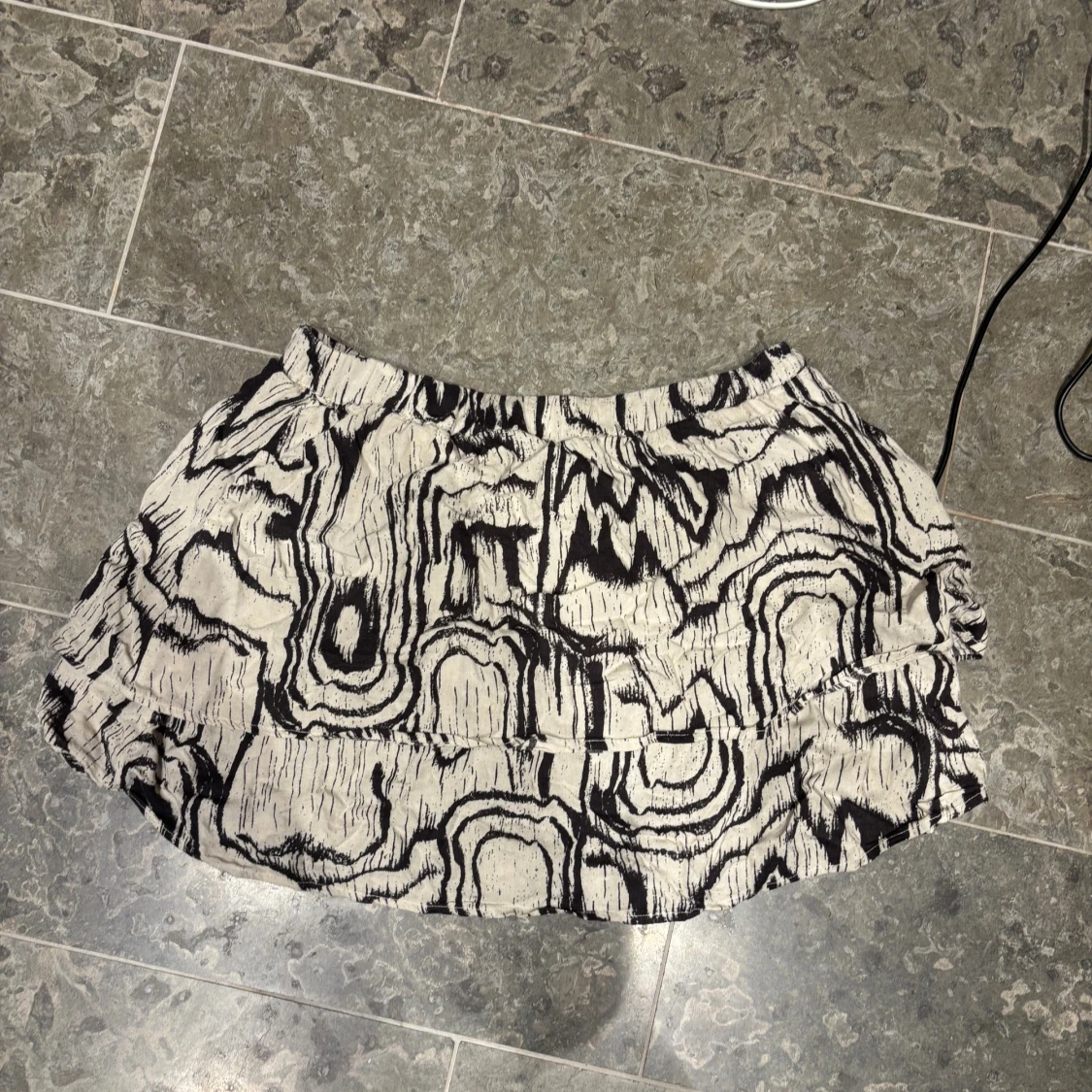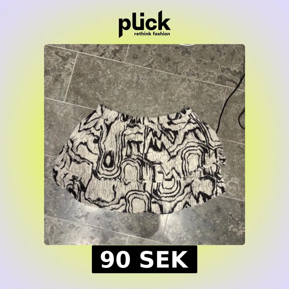 Kort kjol i svart och vitt med ett unikt abstrakt mönster som påminner om träådring. Kjolen har en lätt volang och resår i midjan för skön passform. Perfekt för dig som vill sticka ut med en cool och annorlunda stil.