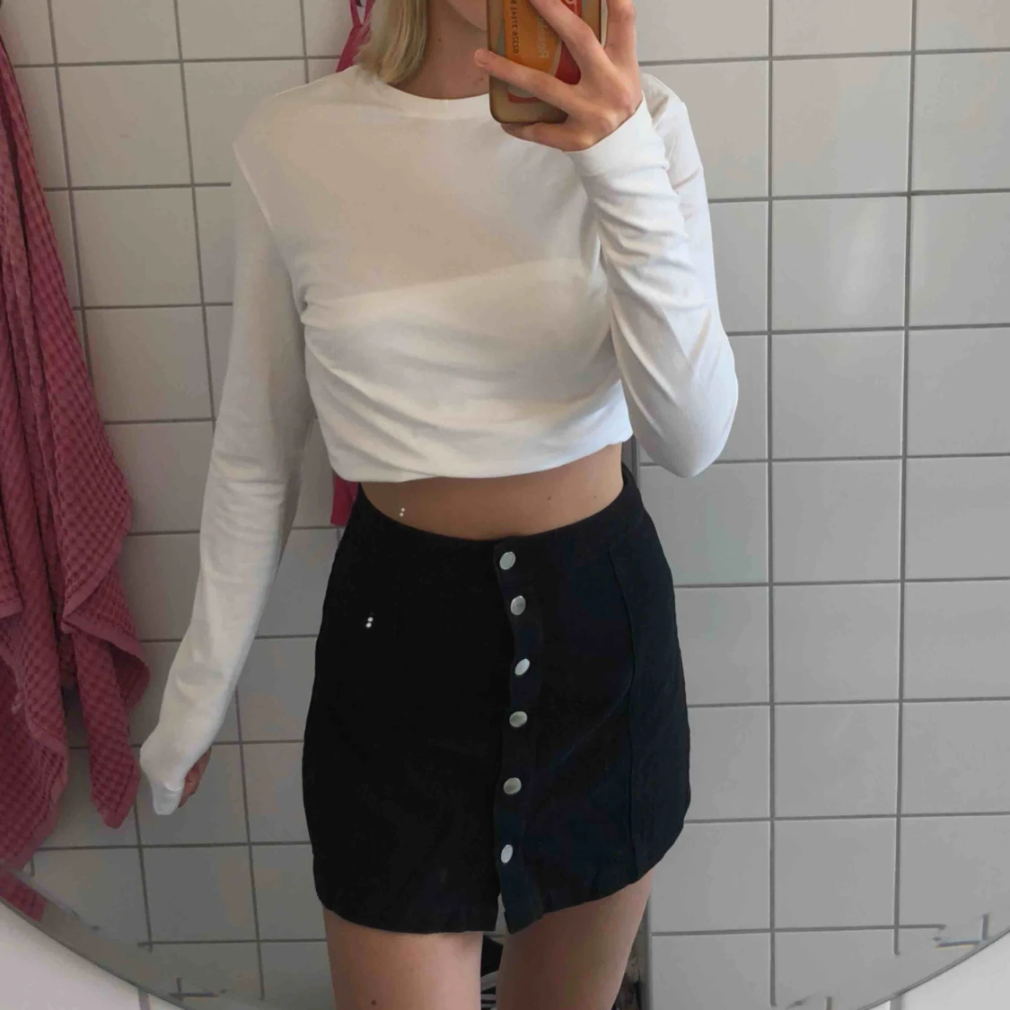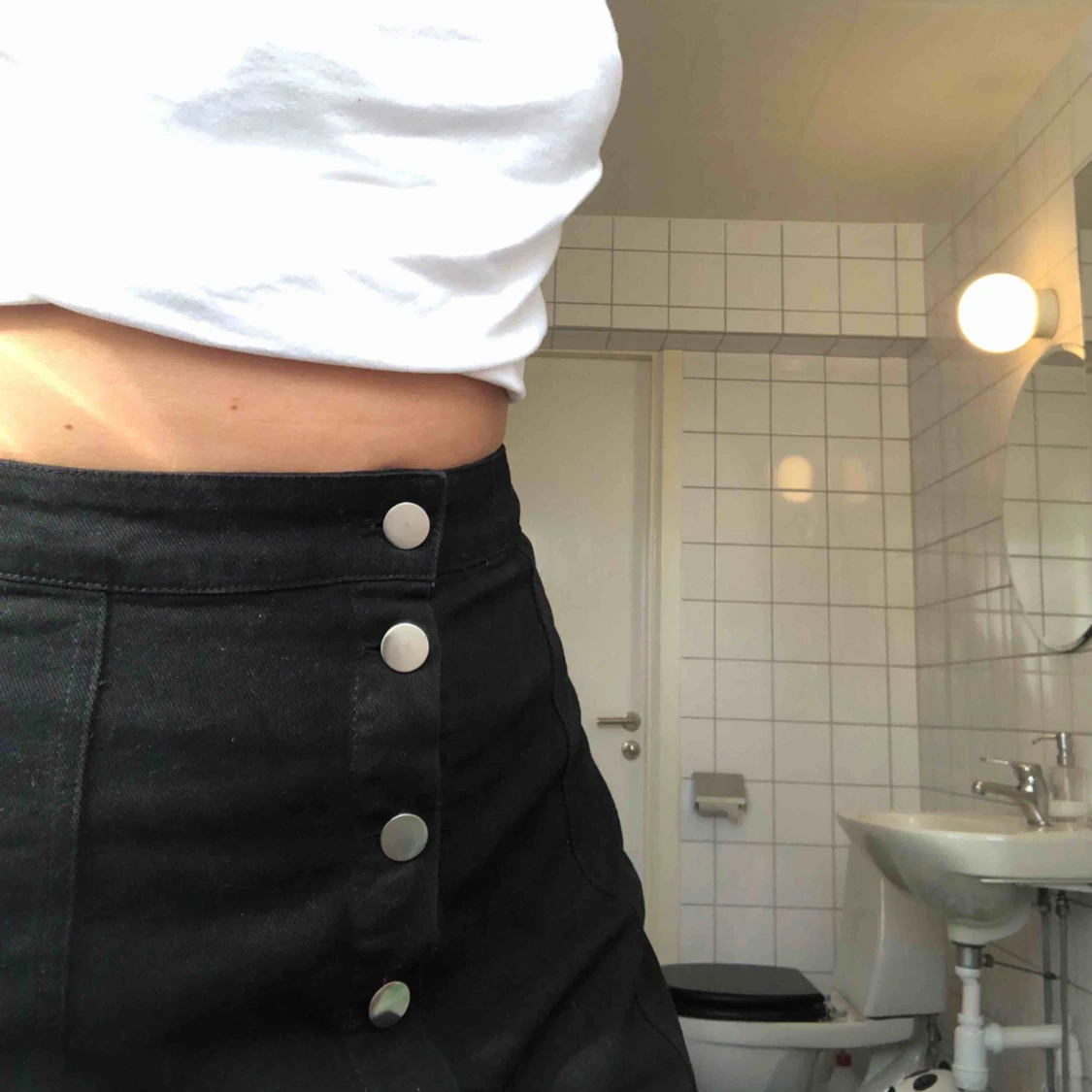 svart kjol med silverknappar framtill. A-formad och kommer från hm. använd några gånger men inget som syns på kjolen.