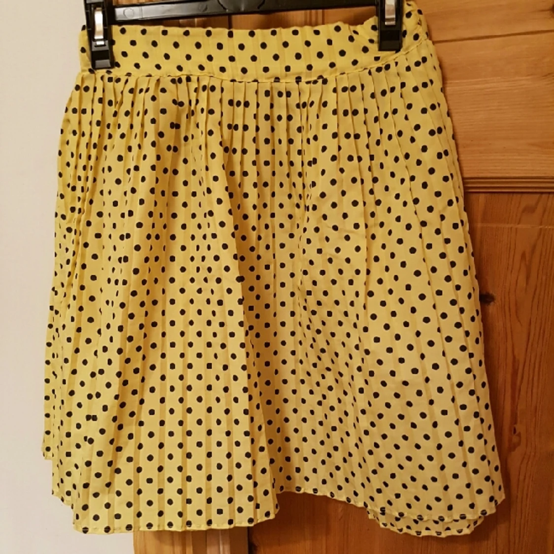 Gul kjol med svarta prickar över hela. Den har ett resårband i midjan så att den är lite uttönjbar. Tunt material. Köparen står för frakt. OBS, katt i hemmet.