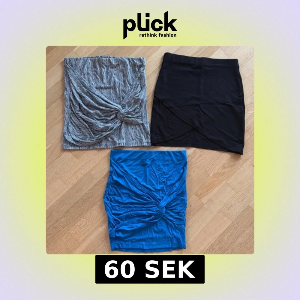 Klädpaket tre minikjolar i olika färger. En svart kjol med enkel design, en blå kjol med knytdetalj och en gråmönstrad kjol med knytdetalj framtill. All passar small/medium.