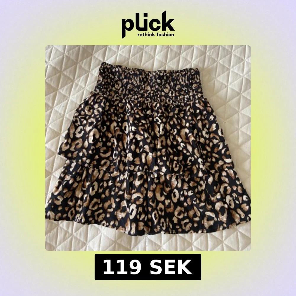Supersnygg kortkjol från Pigalle med leopardmönster i svart, beige och brunt. Kjolen har smock i midjan och volanger. Det står inte storlek men passar mig som har storlek XS eller 158/164 i kjolar. Pris går att diskutera🥰