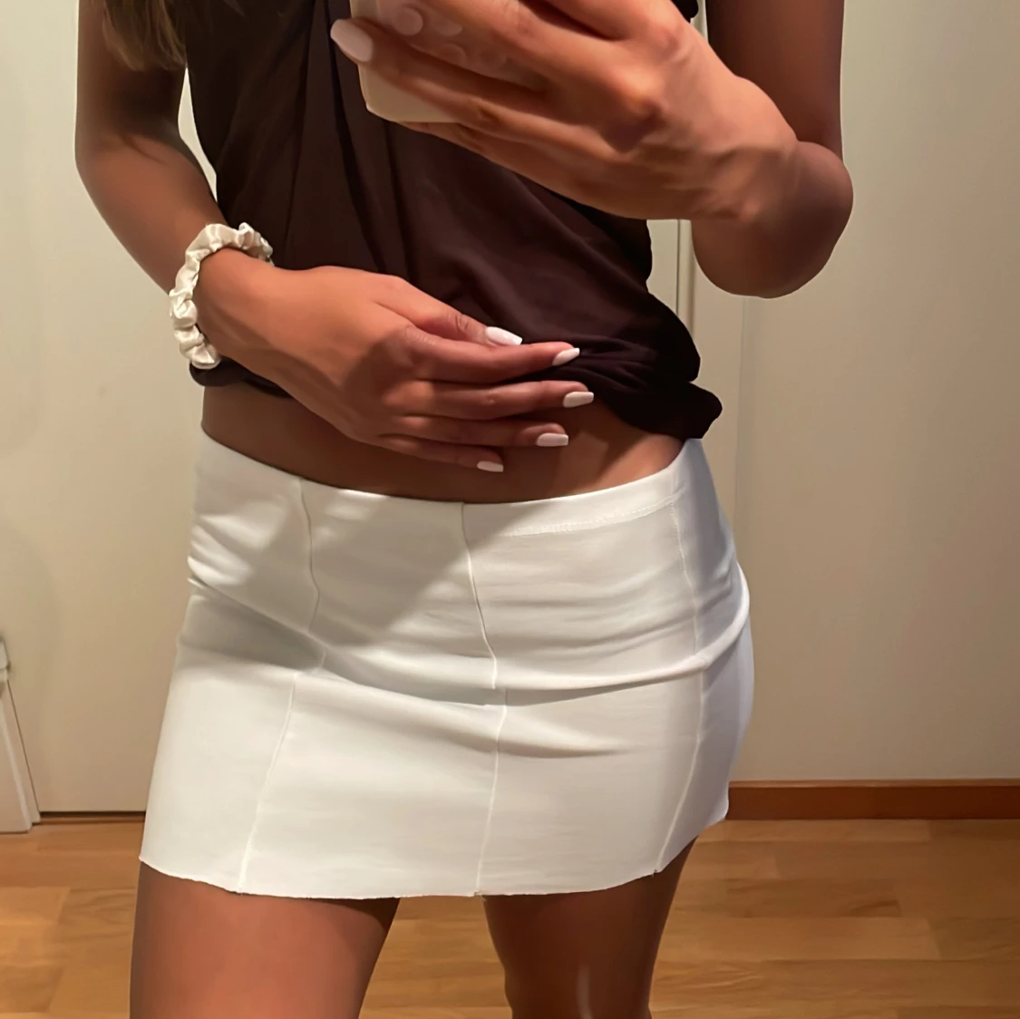 Säljer en vit kortkjol med stilrena sömmar och figurnära passform. Kjolen är enkel och clean i designen, perfekt för dig som gillar minimalistisk stil. Materialet känns stretchigt och bekvämt, vilket gör den lätt att bära hela dagen.