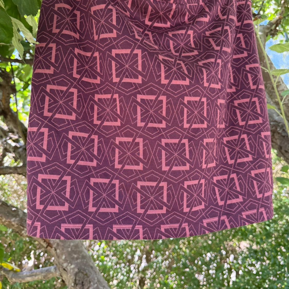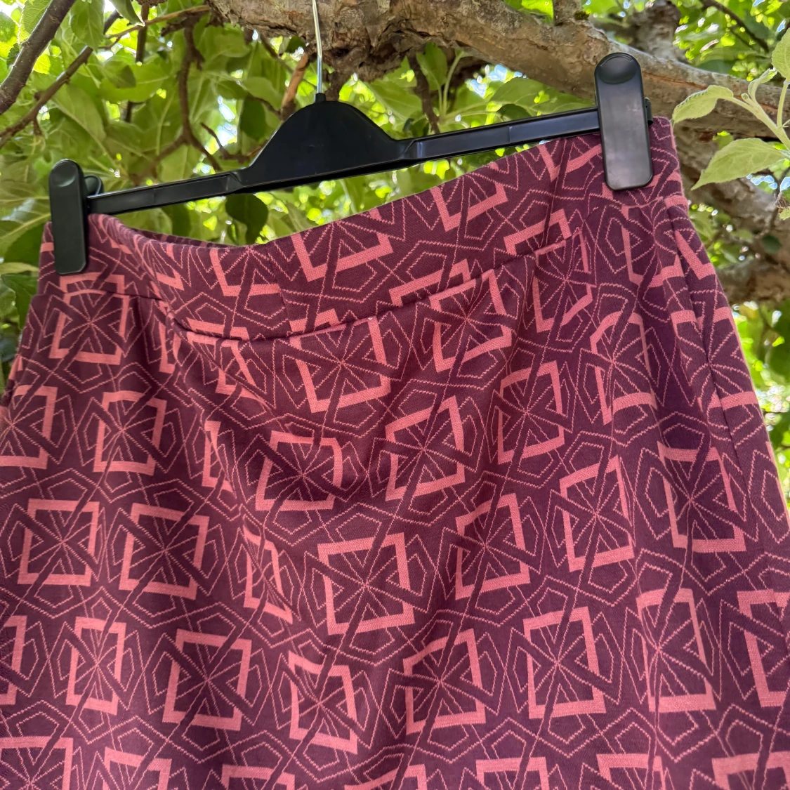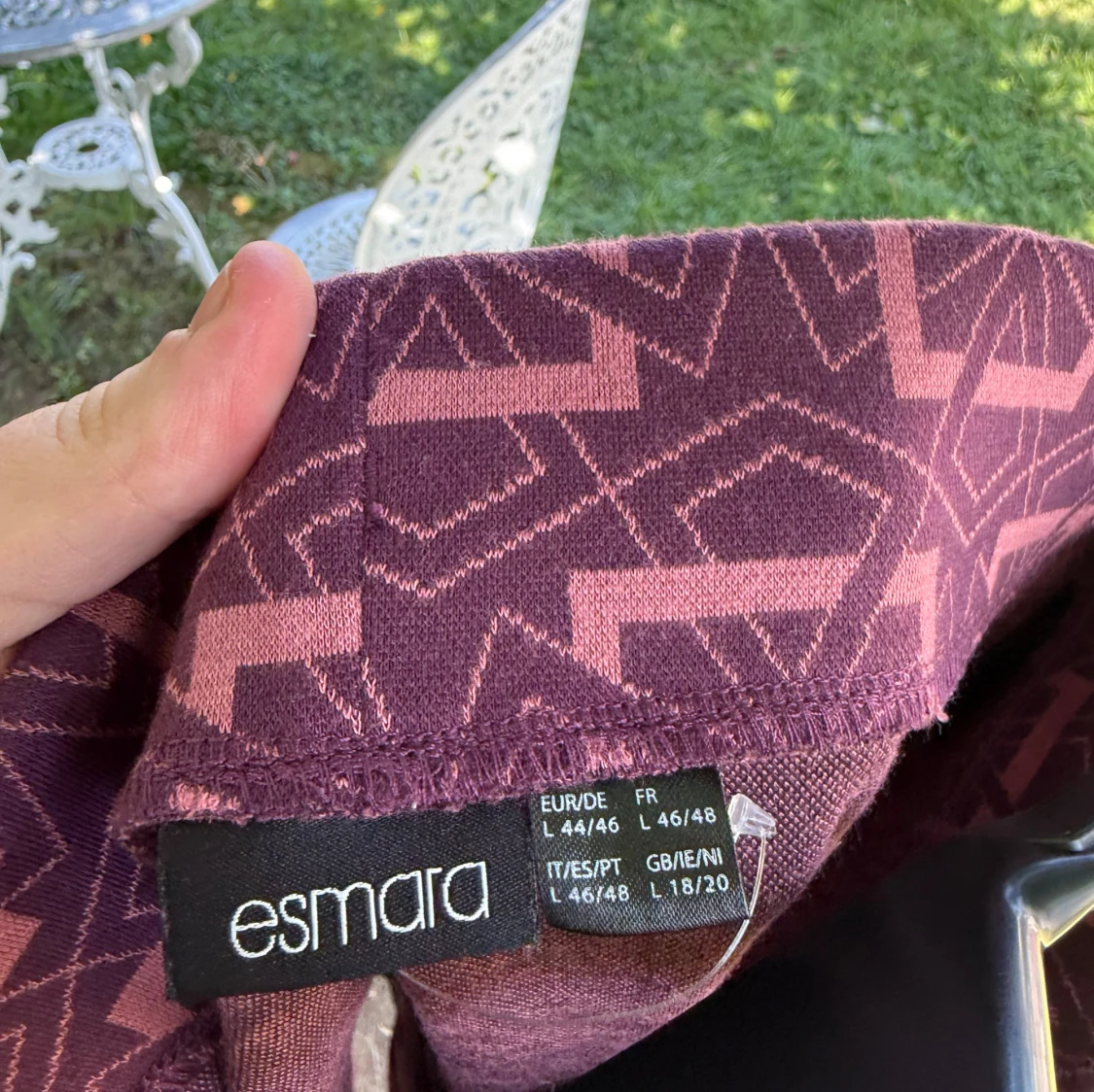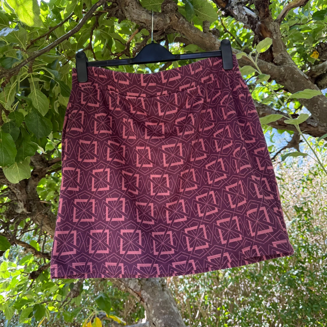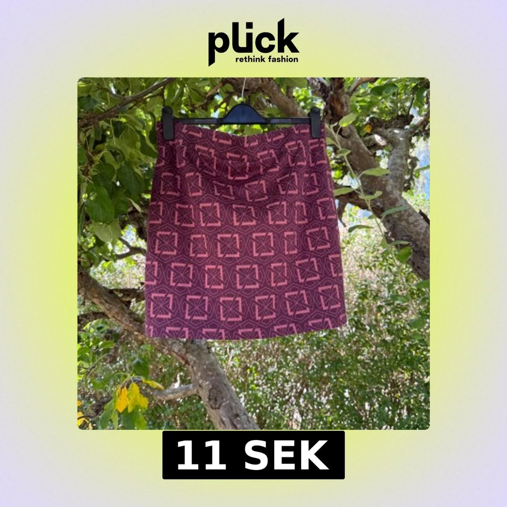Snygg mörklila/rosa kortkjol med rosa geometriskt mönster. Storlek L. Kjolen har en rak och enkel form som ger en clean look. Materialet känns mjukt och följsamt, perfekt för dig som gillar att sticka ut med coola detaljer och färger. Mycket fint skick, jag hittar inga synliga anmärkningar eller defekter. Den har aldrig använts men bara ledat i garderoben och i förrådet ett bra tag.