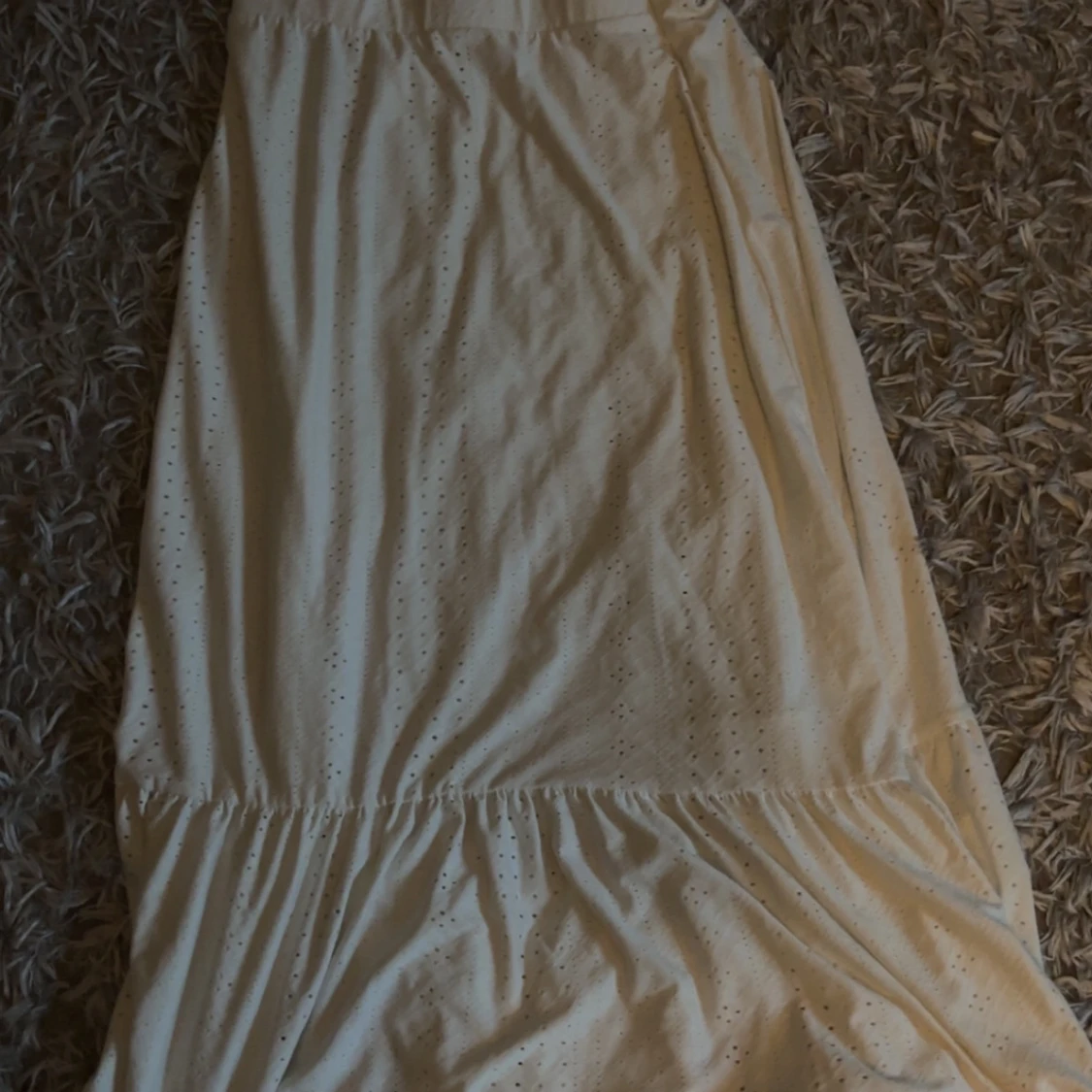 Säljer en vit långkjol från JDY i storlek L. Kjolen har broderade hålmönster och en volang nedtill som ger en chill och feminin vibe. Perfekt för varma dagar och har en luftig passform. Materialet känns mjukt och är troligtvis bomull.