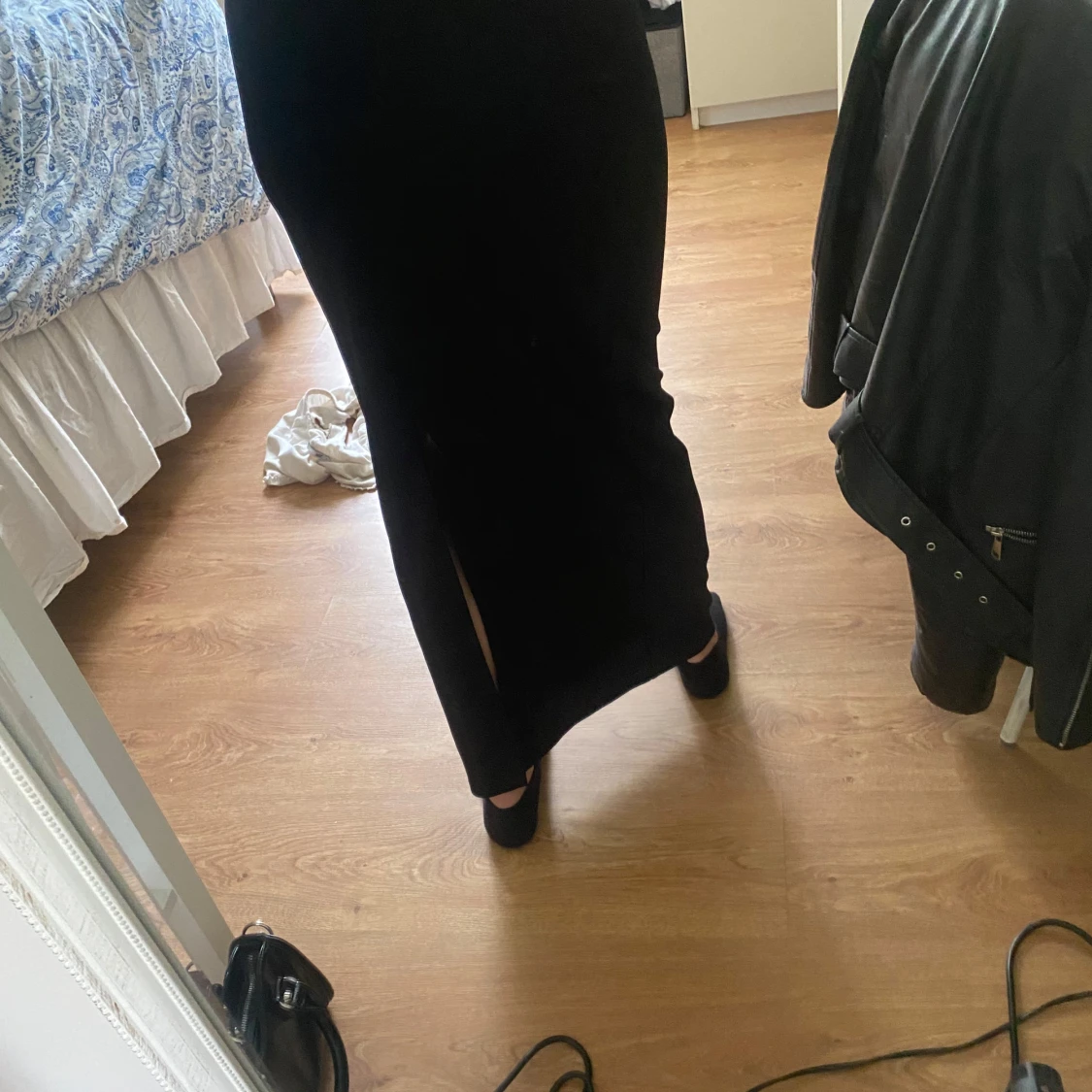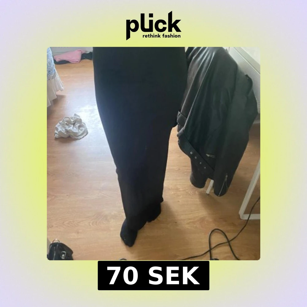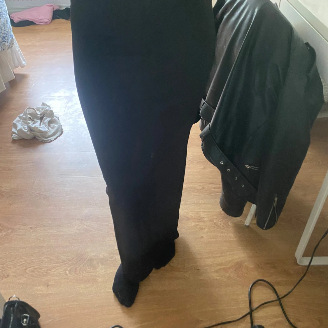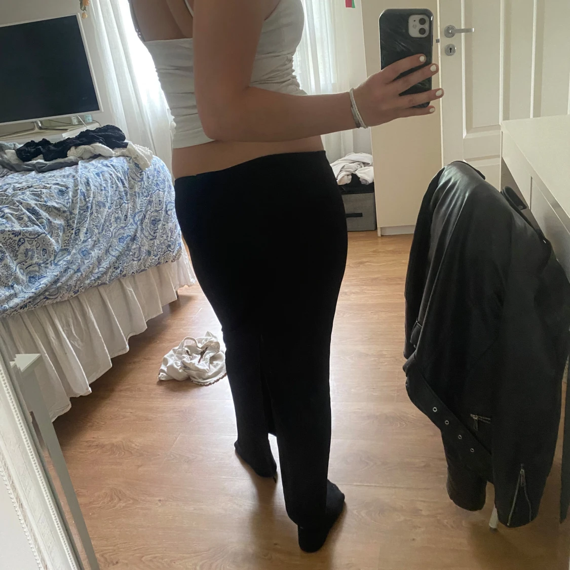 Säljer en svart kjol med vid passform och snygg slits nertill på benen. Kjolen har låg midja och är perfekta om du gillar en loose och chill stil. Materialet känns mjukt och stretchigt, superbekväma att ha på sig hela dagen.