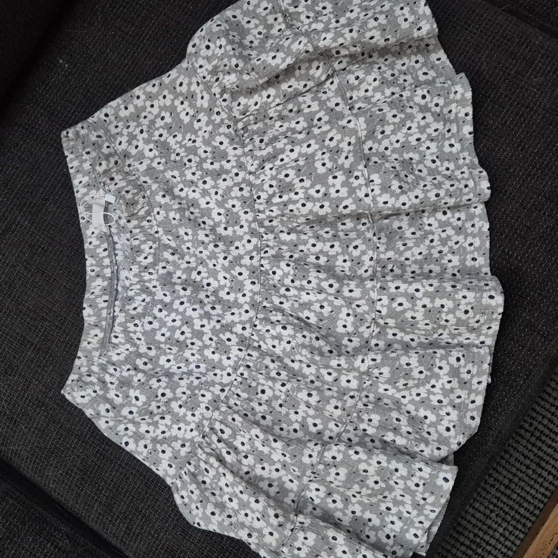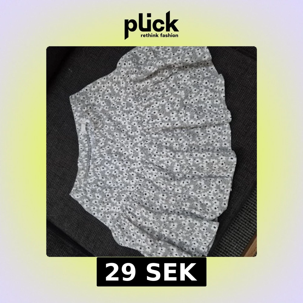 Supersöt grå/grön kortkjol med vita blommor och volangkant. Kjolen har en avslappnad passform och är perfekt för varma dagar. Väldigt stretchigt material.
