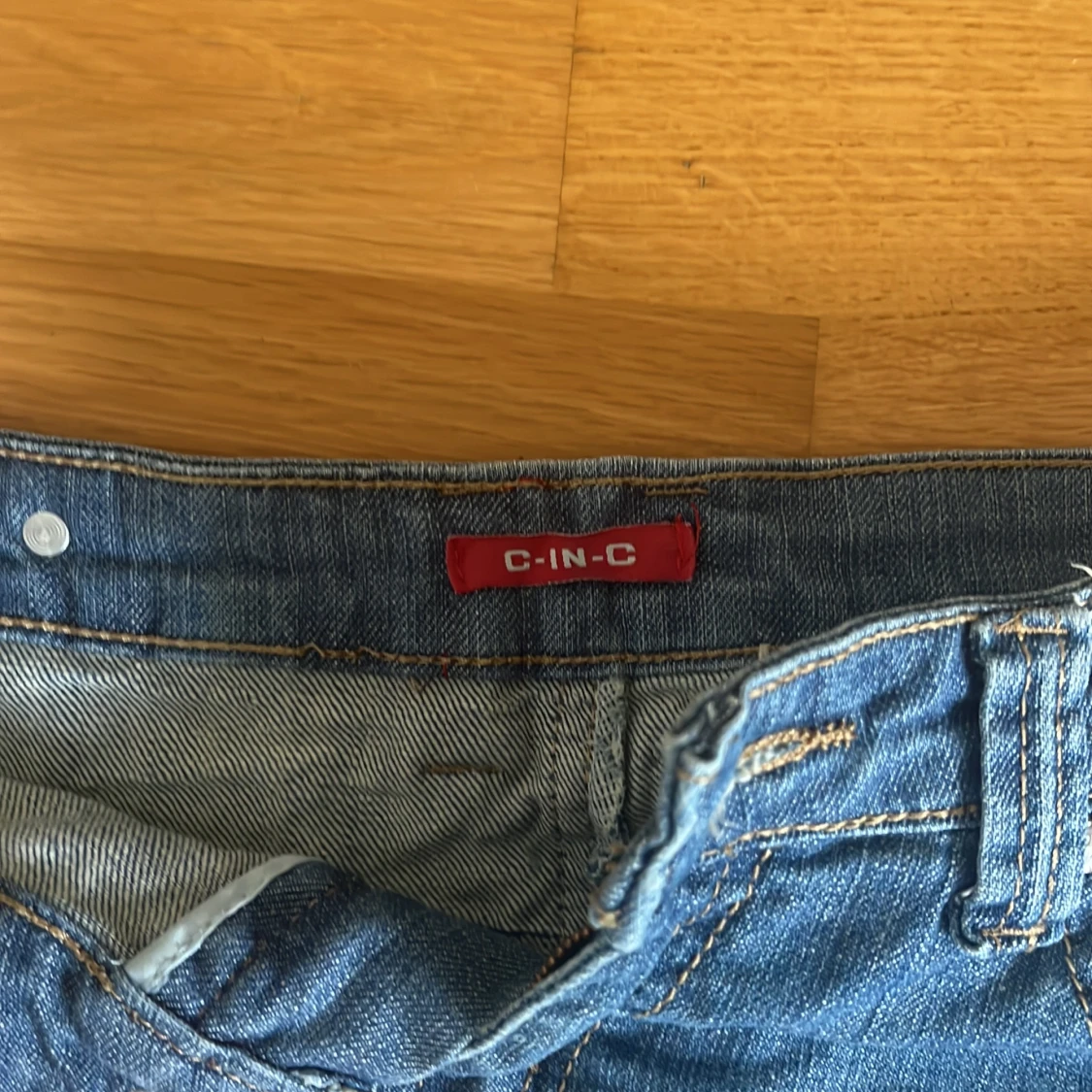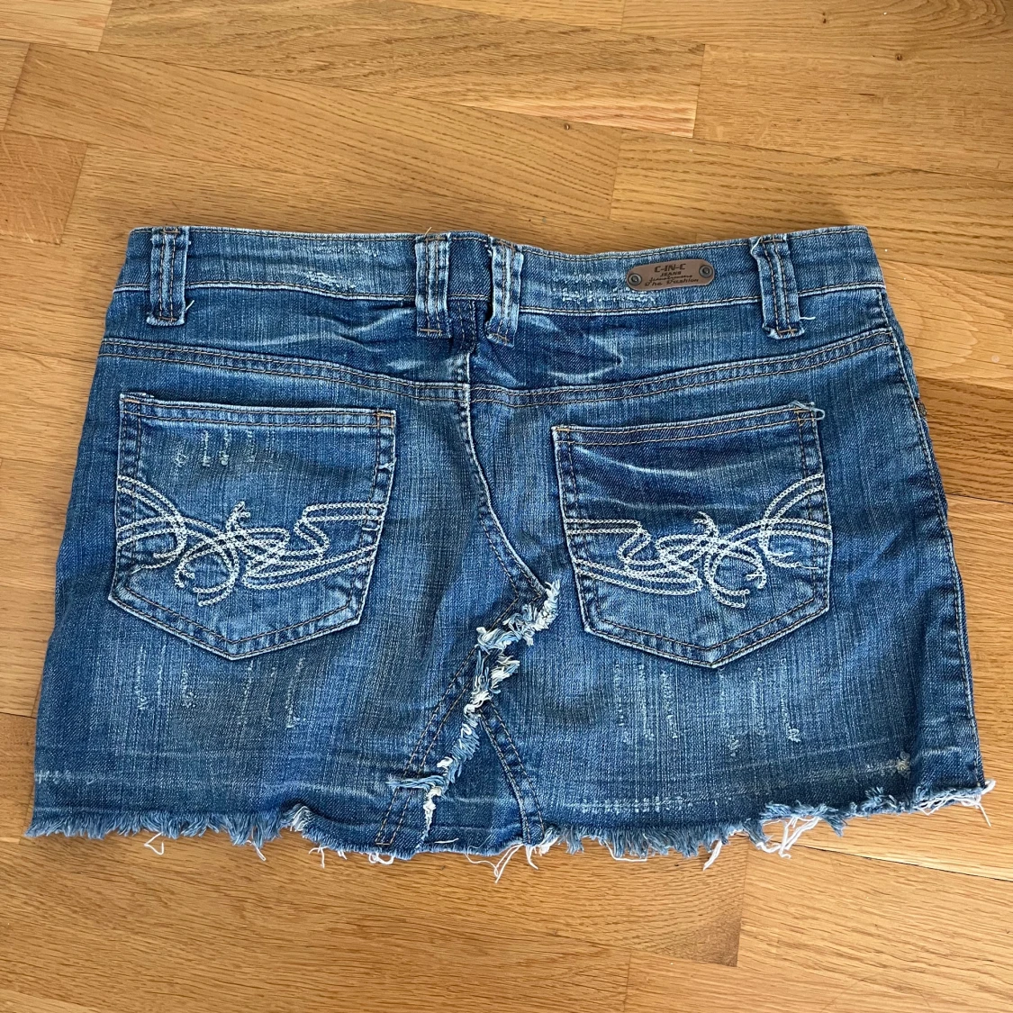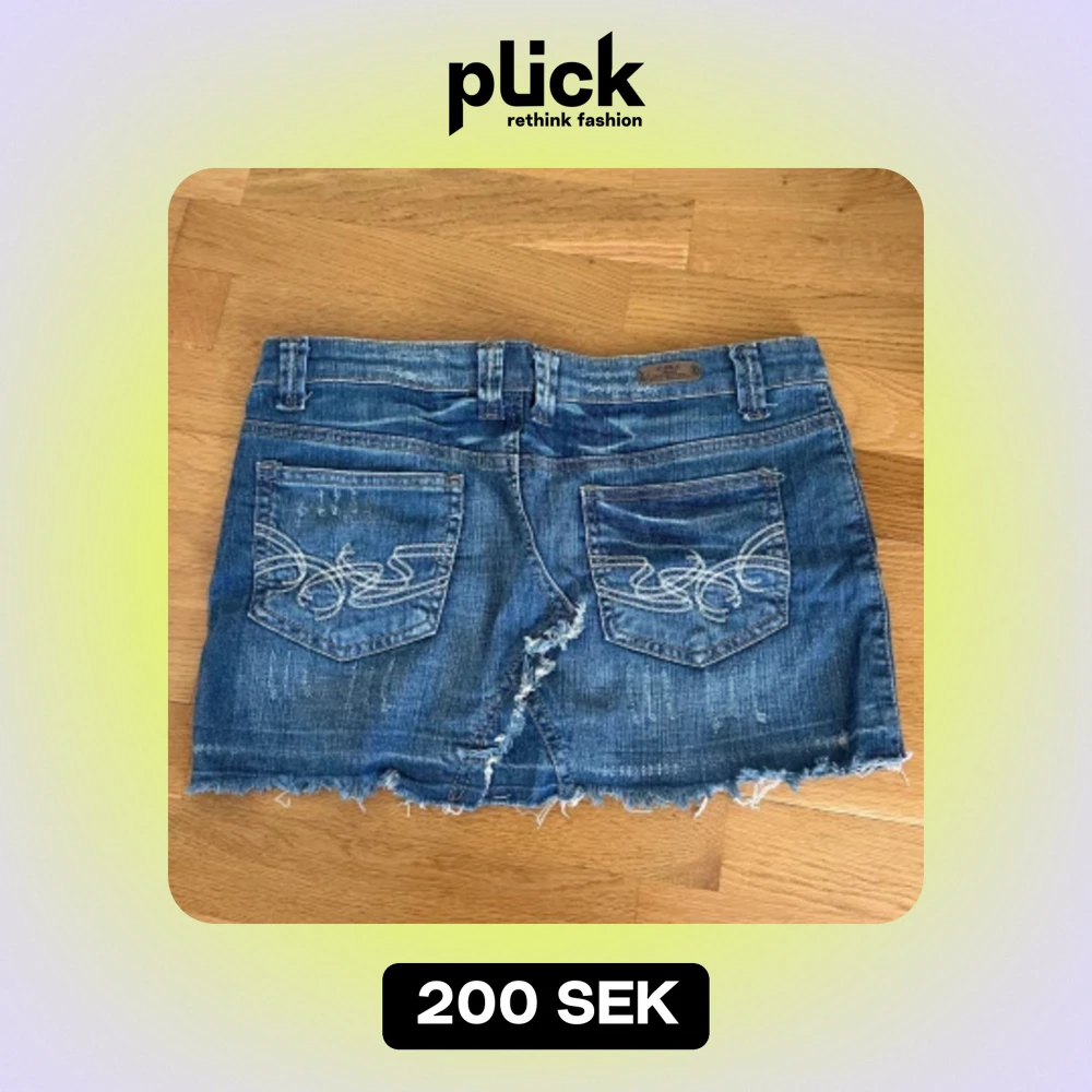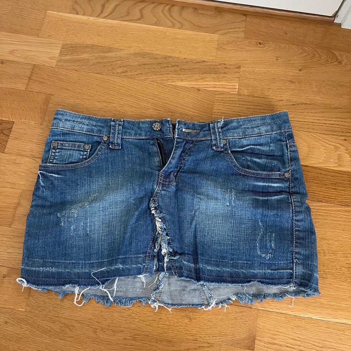 Trendig lågmidjad jeanskjol i fin färg med snygga fickor, bra skick! 💕 tyvärr för stor för mig, passar S. Midjemått: 84 cm (42 rakt över), Längd: 32 cm