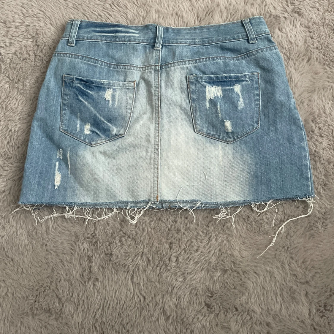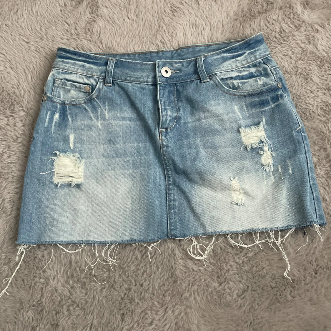 Ljusblå jeanskjol från Vila i kort modell med slitna detaljer och fransig nederkant. Perfekt för en avslappnad och trendig look. Priset är ej hugget i sten. Storlek M men passar även S