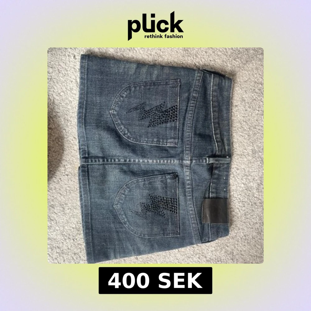 Cool mörkblå jeanskjol från NOW med två stora bakfickor dekorerade med svarta nitar i blixtform. Klassisk femficksmodell, bälteshällor och knappstängning. Perfekt för dig som gillar edgy detaljer och streetstyle.