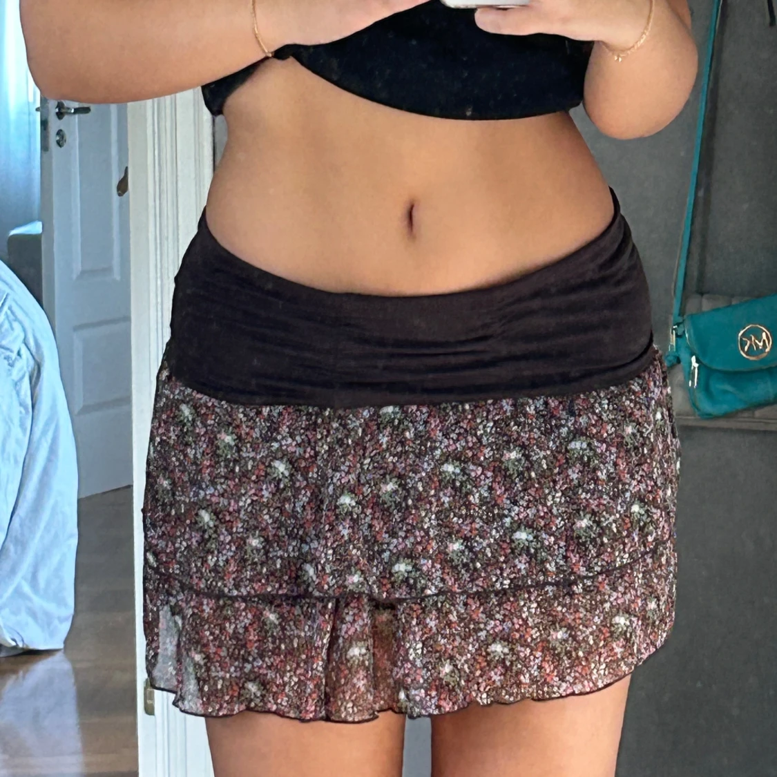 Säljer denna lågmidjade korta brun blommiga kjol!! Så jävla snygg men den är tyvärr lite för liten på mig. Älskar lågmidjat och tycker de är så snyggt med den tjocka bruna kanten. Väldigt mjuk och har även en silkes kjol under så man inte ser igenom