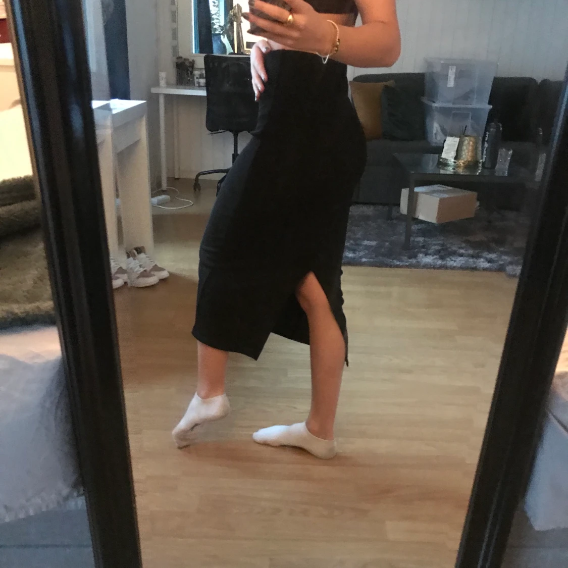 Denna långa svarta refflade kjol med slits ger en så fin form på kroppen men är inte för tajt! Så fin till både höst och sommar
