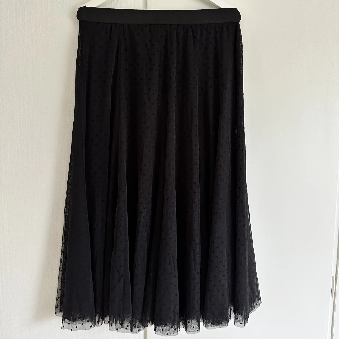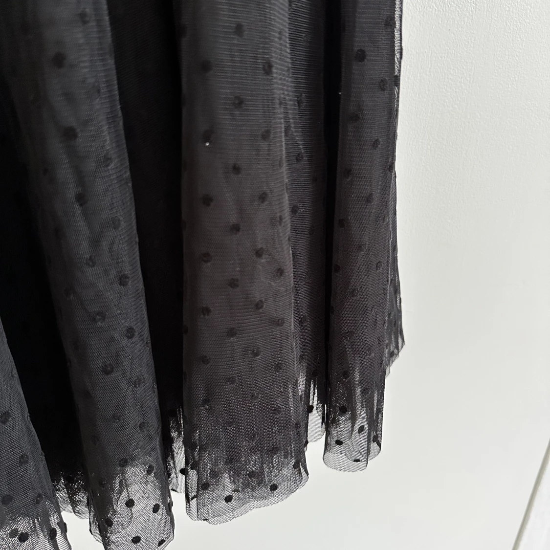 Svart tyllkjol i prickigt tyg. Aldrig använd. 40 kr exkl frakt.