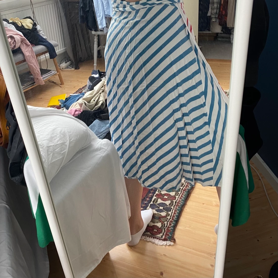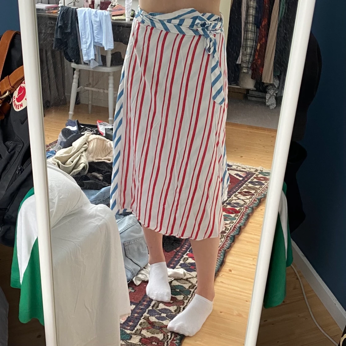 Strl L, men jag har S i vanliga fall. Kjolen är omlott så man kan knyta den i midjan efter behov. Så passar de flesta strl! Kan knytas så de blå eller röda är fram / bak. 💘💘💘