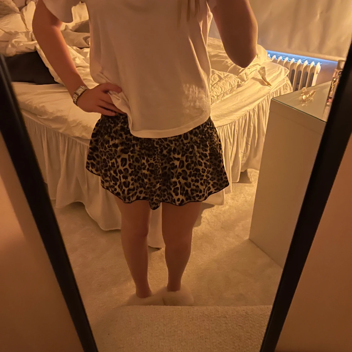 Säljer en snygg kortkjol med leopardmönster. Kjolen har en lätt utställd passform och resår i midjan för extra komfort. Färgerna går i brunt, svart och beige vilket gör den enkel att matcha med olika toppar. Perfekt för dig som vill sticka ut lite extra.