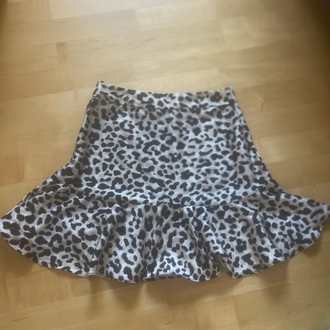 Snygg kjol från New Yorker med leopardmönster i svart och beige. Kjolen har volang nertill som ger en extra touch och är i ett lätt, glansigt material. Finns dragkedja på sidan😊