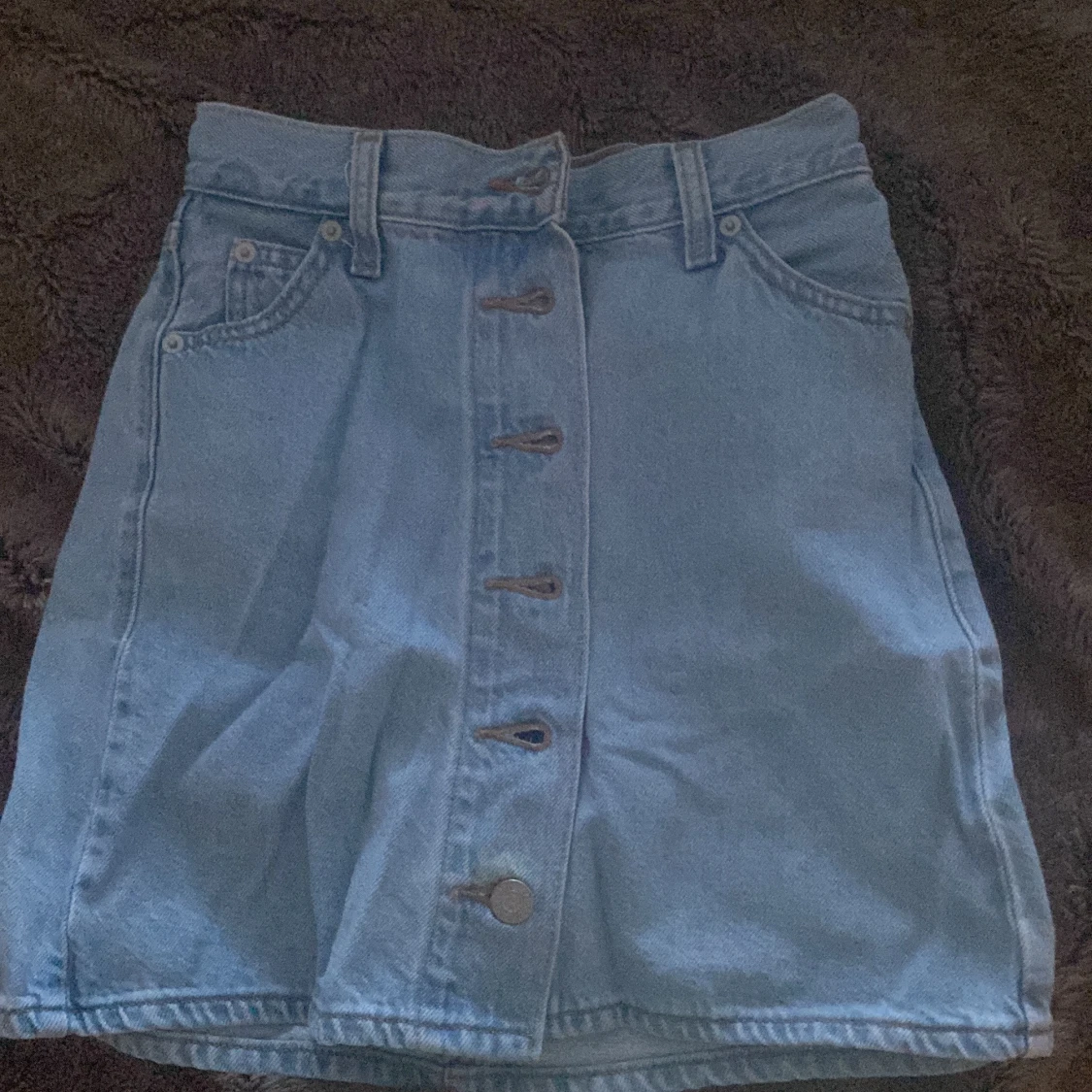Säljer en klassisk ljusblå jeanskjol från Levi's med knappar framtill och två bakfickor. Kjolen har bälteshällor och en rak passform som passar perfekt till vardags. Ikonisk Levi's-lapp baktill i midjan.