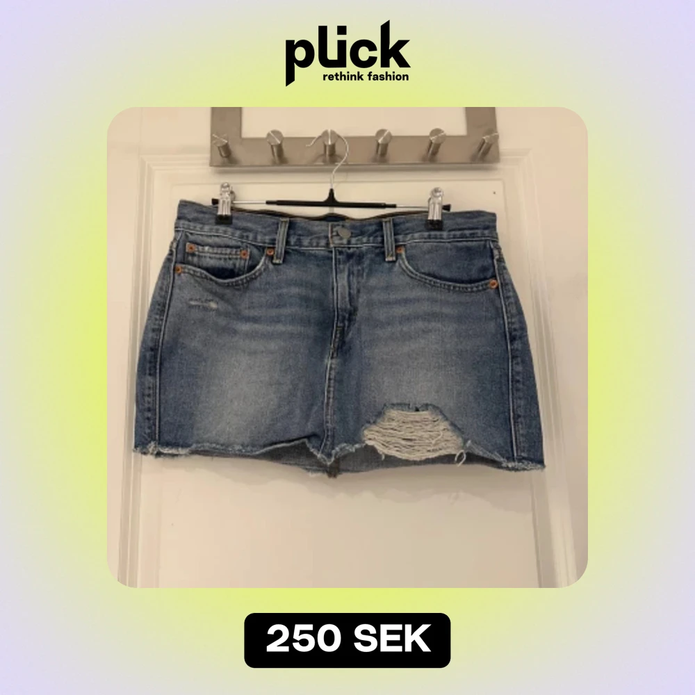 Säljer denna supersnygga korta jeanskjolen från Levis med slitningar. Storlek W28, skulle säga att det motsvarar S/M. Precis som nyskick!