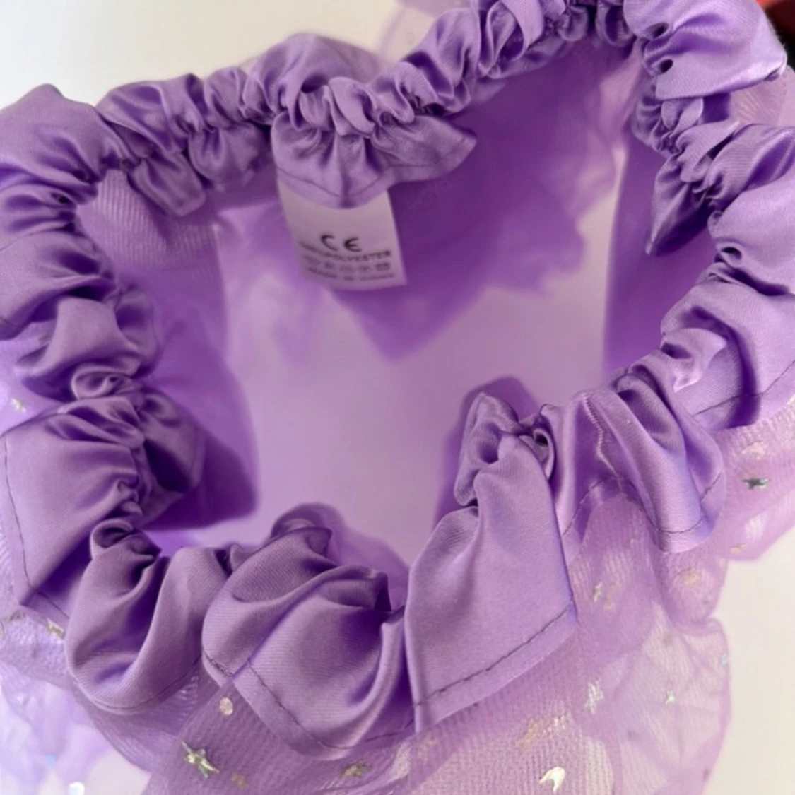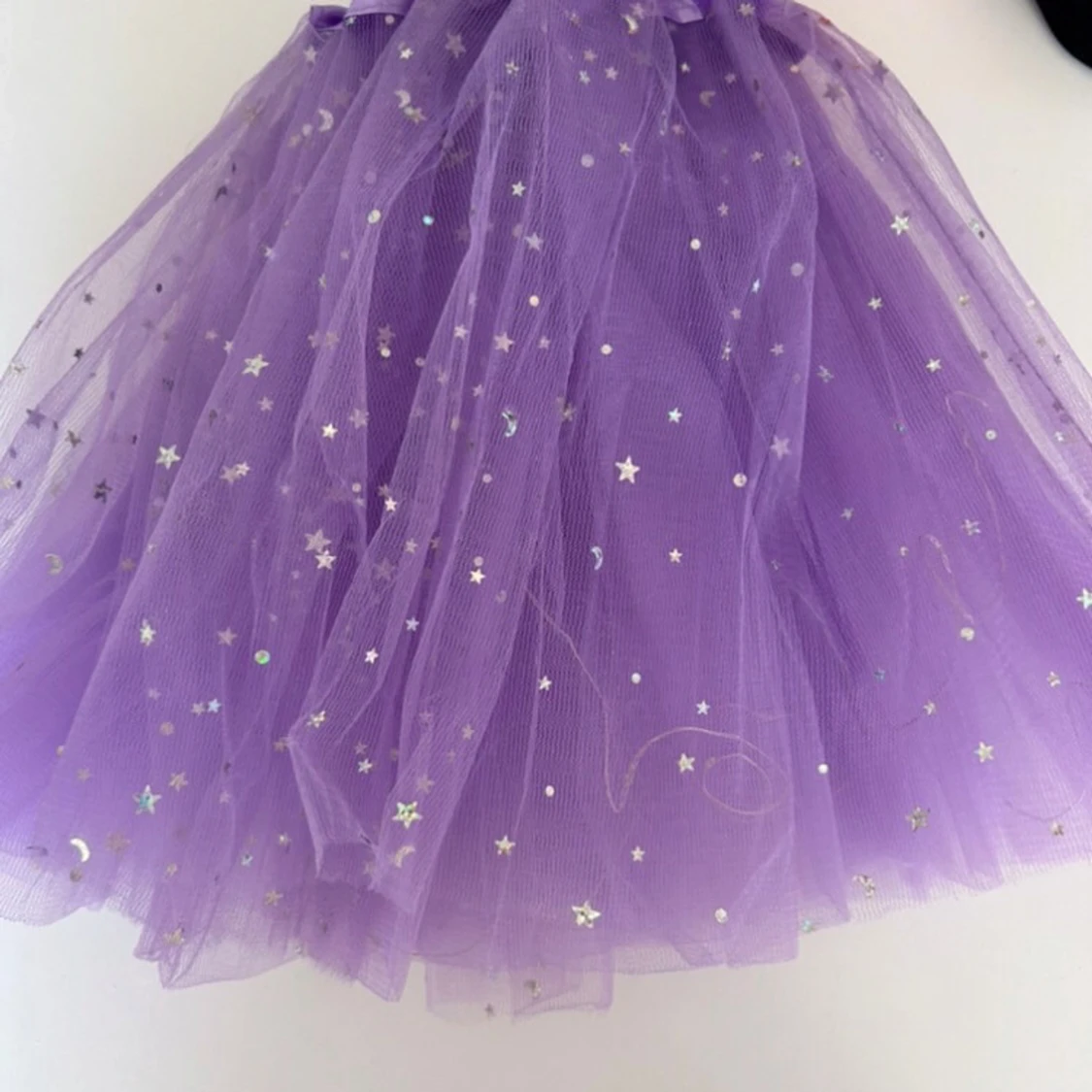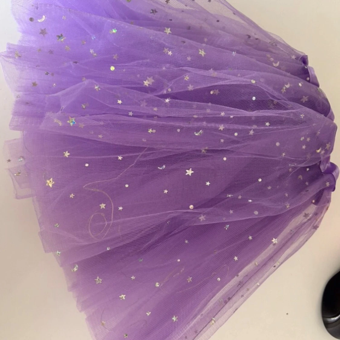 Superfin lila kortkjol i tyll med glittriga silverstjärnor och månar. Kjolen har bred resår i midjan med volangkant som ger extra fluff och söt vibe. Perfekt för dig som vill sticka ut med en magisk look!