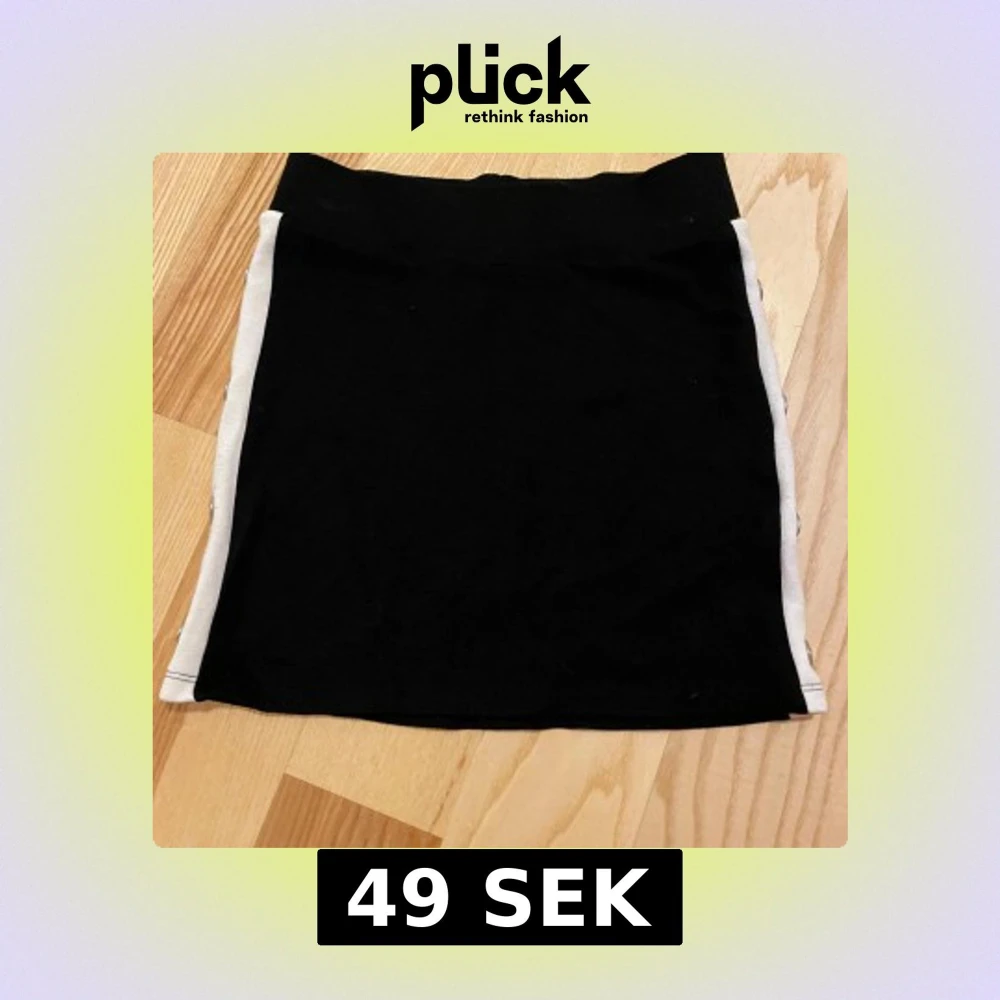 Svart kortkjol från Lindex med vita sidor och silvriga knappar längs båda kanterna. Kjolen har en enkel, rak passform och är gjord i mjukt bomullstyg. Perfekt för dig som gillar sportig och stilren look.