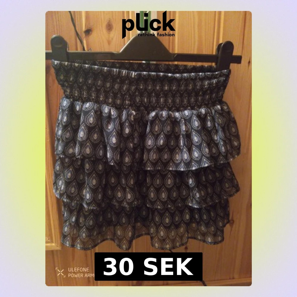 Snygg kortkjol från Lindex med mörkblå botten och droppformade mönster i blått och vit. Kjolen har flera lager volanger och en bred, smockad midja som ger en skön passform.