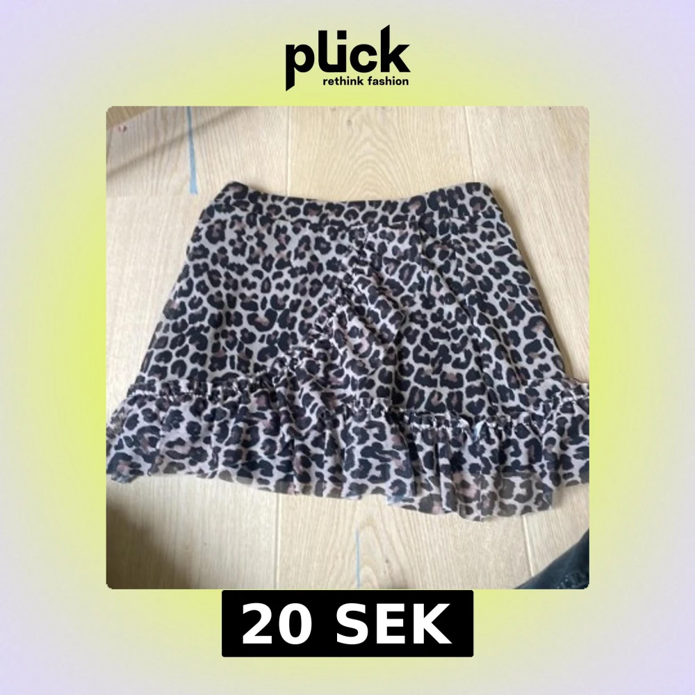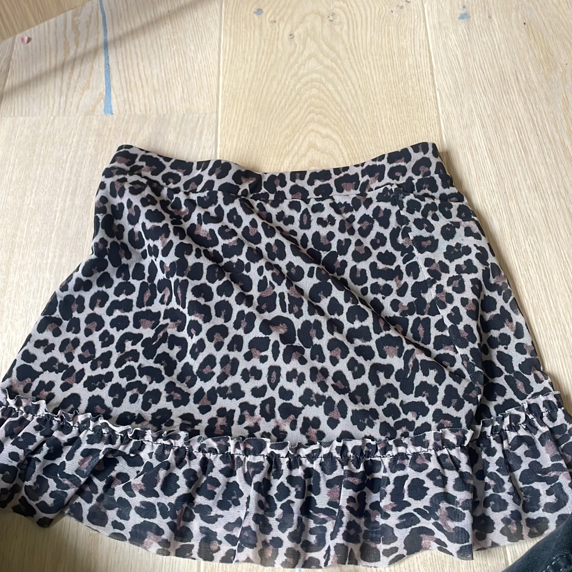 Säljer en kort kjol från Lindex med leopardmönster i svart och beige. Kjolen har volangdetalj längs nederkanten och omlottkänsla framtill. Perfekt för dig som vill sticka ut med ett djurmönstrat plagg.