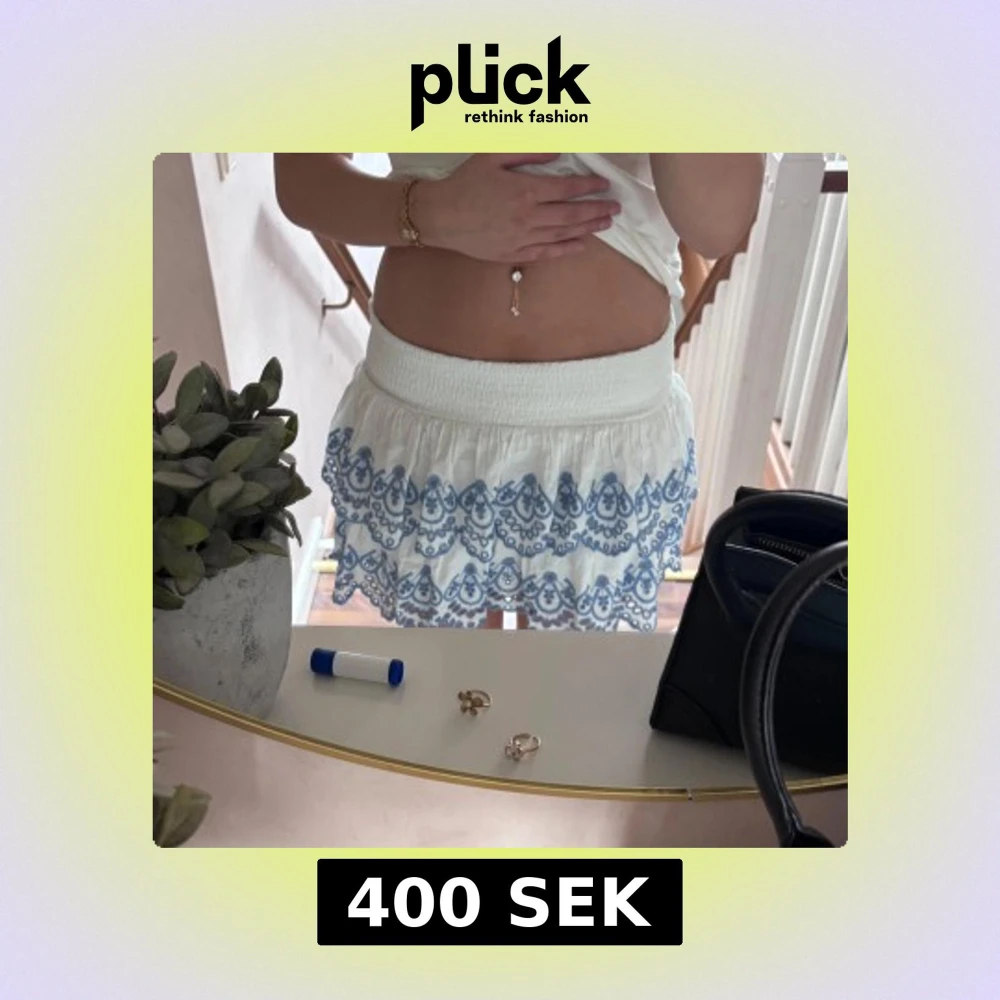 Supersöt vit kjol med bred resår i midjan och blå broderade mönster längs nederkanten. Kjolen är kort och har en luftig känsla, perfekt för varma dagar. Broderierna ger en unik och fräsch look. Skriv för fler bilder, kjolen är ner vikt i midjan på bilen💕aldrig använd, den är väldigt stretchig